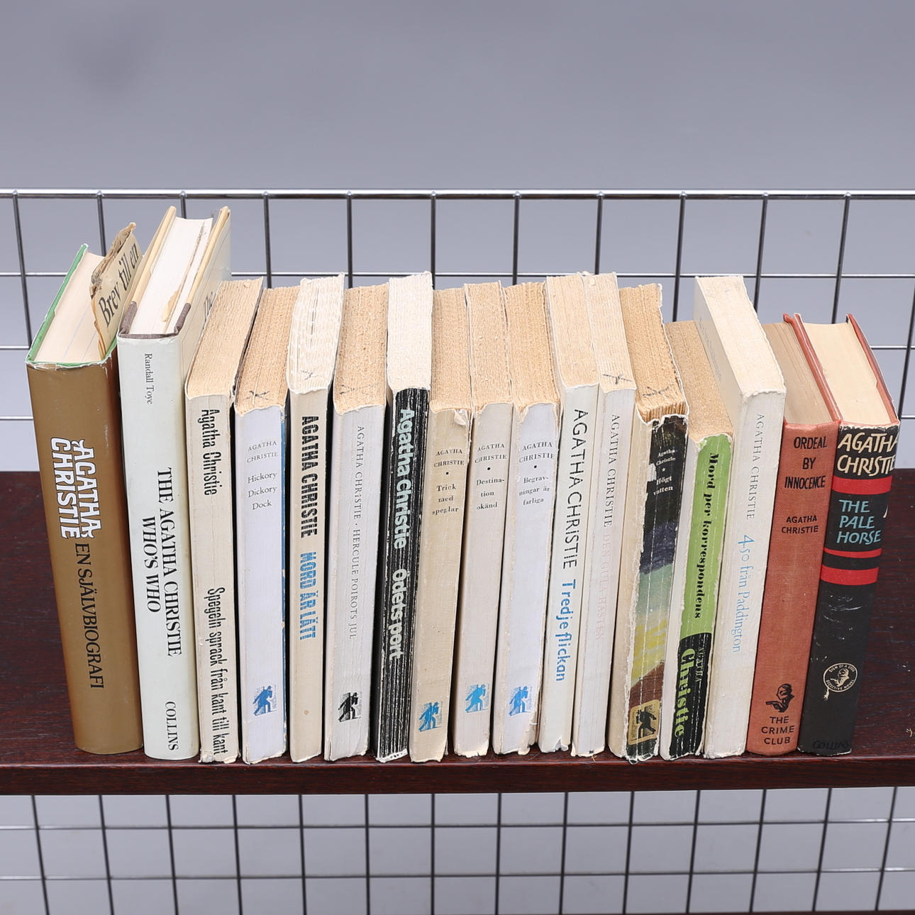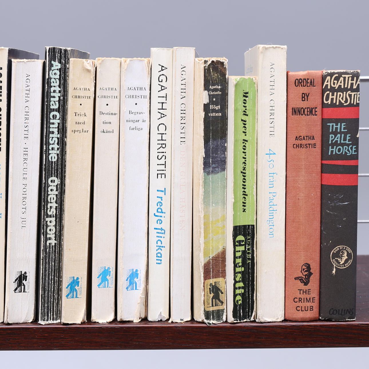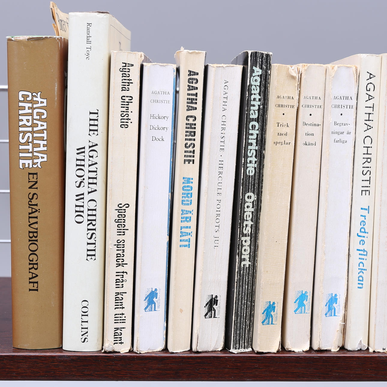 13 böcker på svenska, 2 på engelska, AC:s självbiografi samt "The Agatha Christie Who's Who" av Randall Toye.