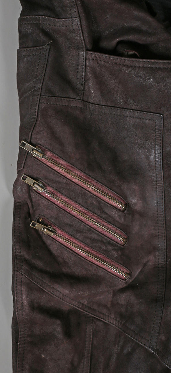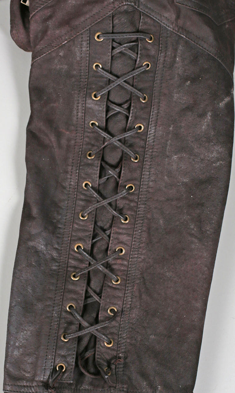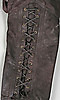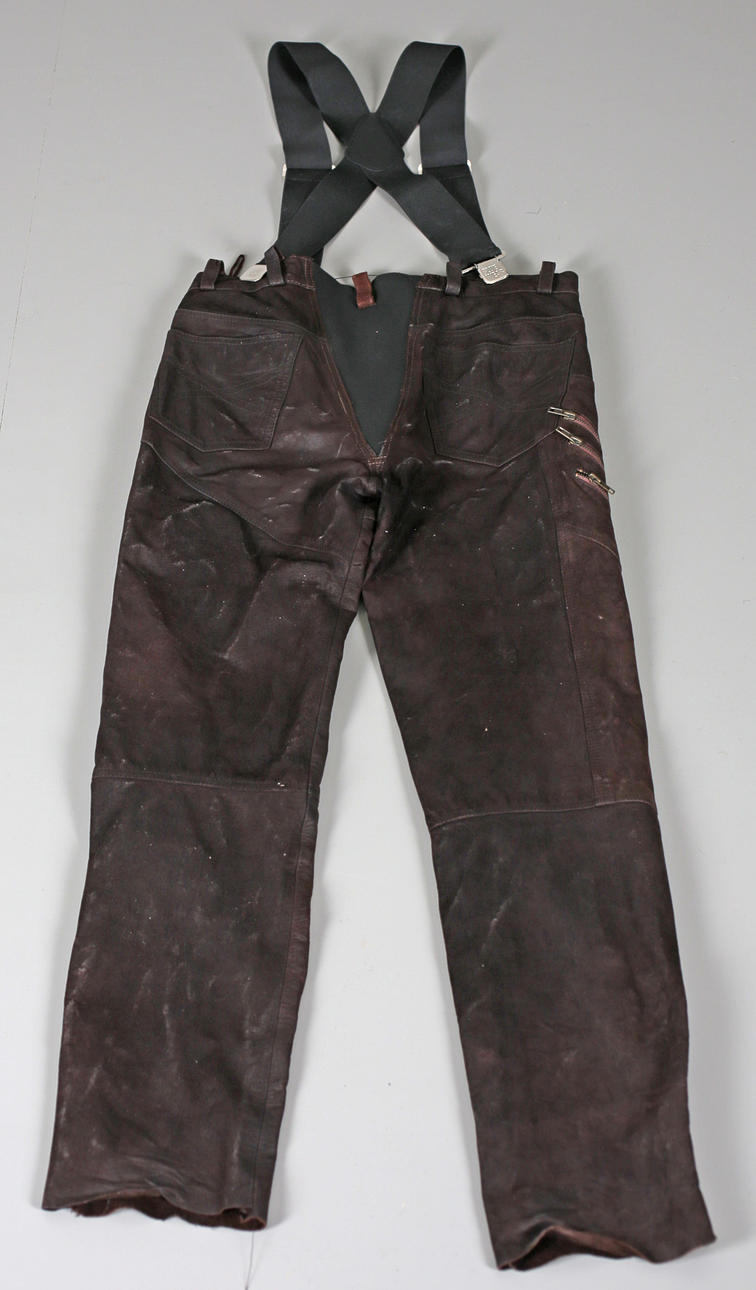 Troligen brun nubuck. Delvis fodrade. Ett byxben med flätade detaljer. Hängslen medföljer.