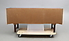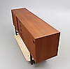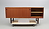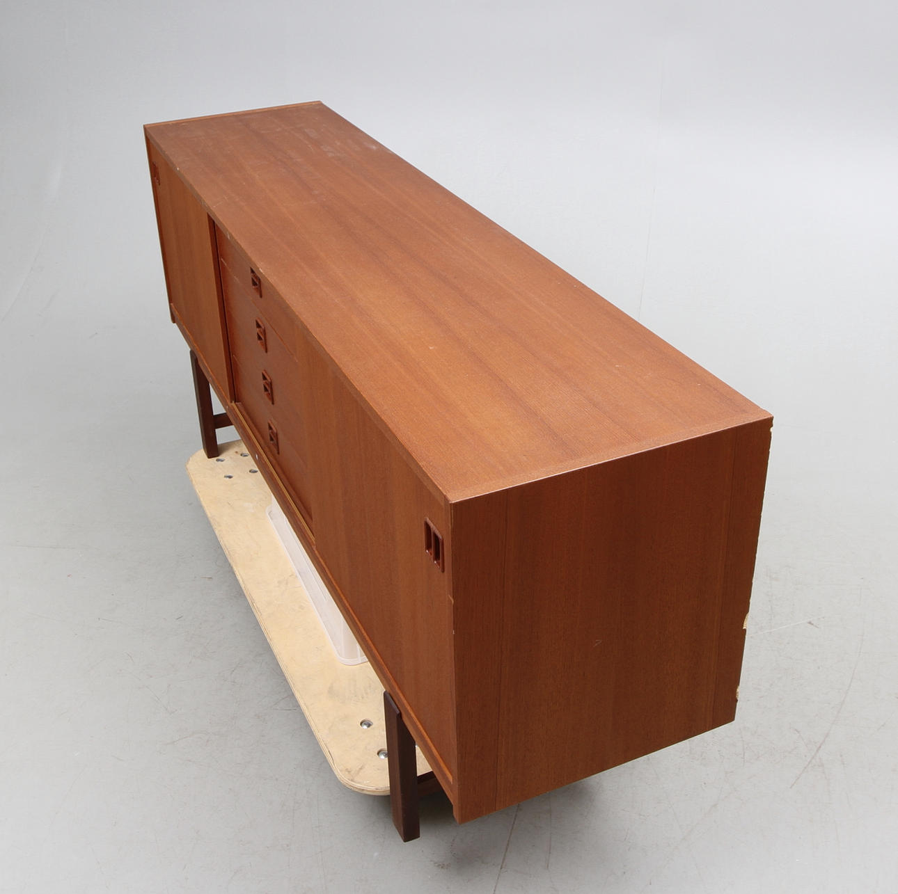Fanerat i teak. Skjutdörrar/4 lådor. Längd 170, bredd 42, höjd 72 cm.