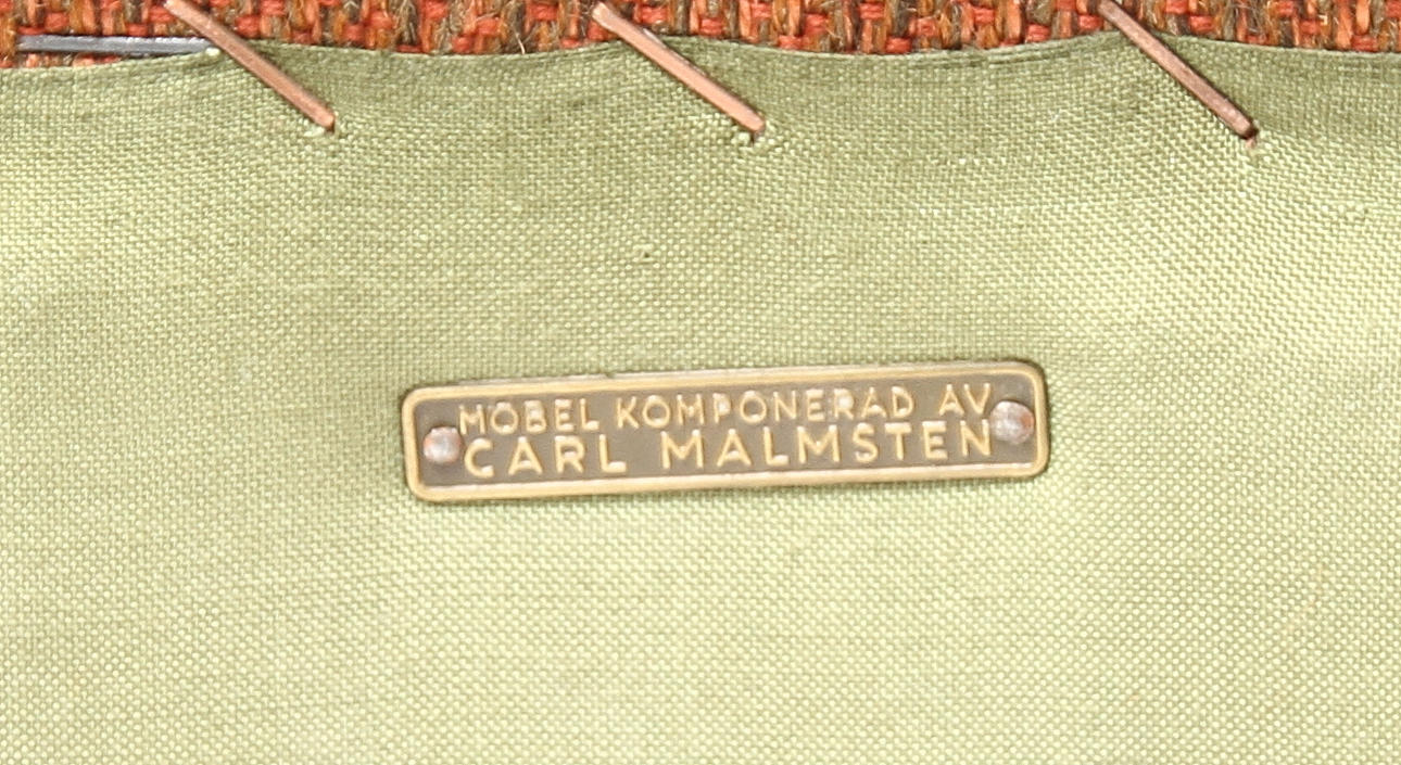 Brun klädsel, skyltmärkt Carl Malmsten, soffans längd ca 210 cm.