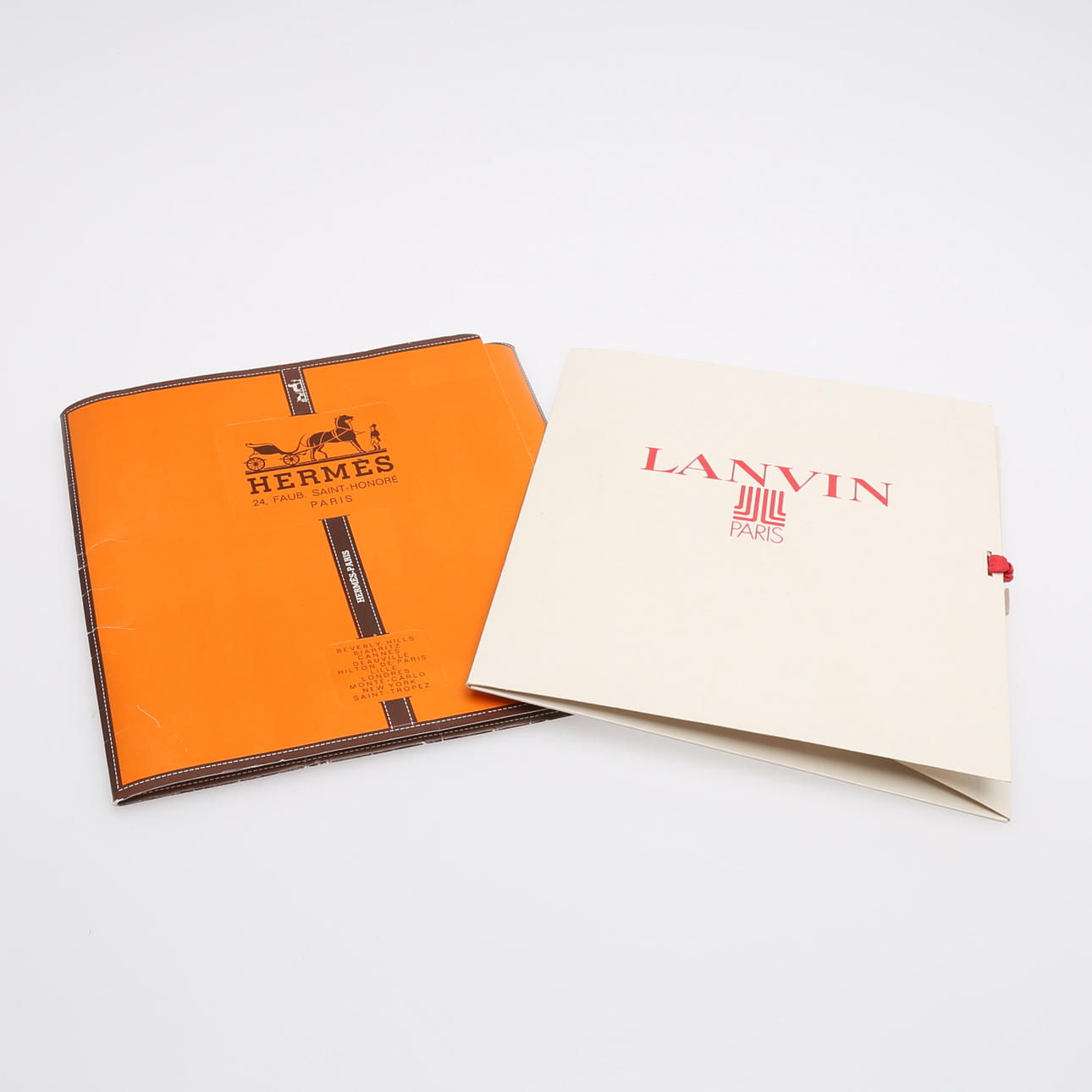 I originalförpackningar, Hermes ca 89x84 cm, Lanvin ca 77x75 cm.