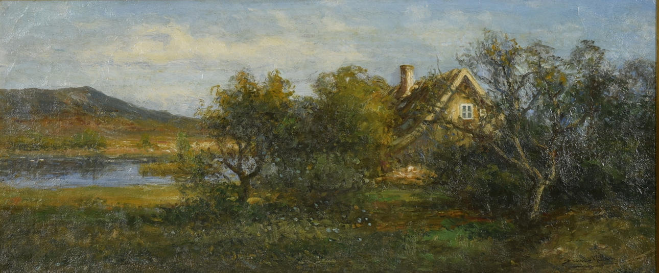 Halländskt landskap med stuga. Signerad 34x78 cm.