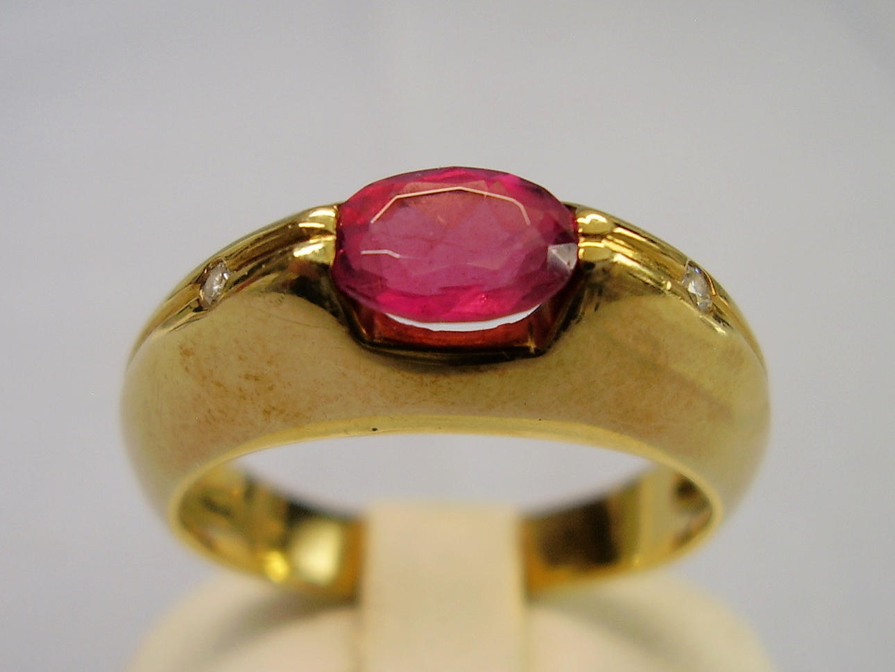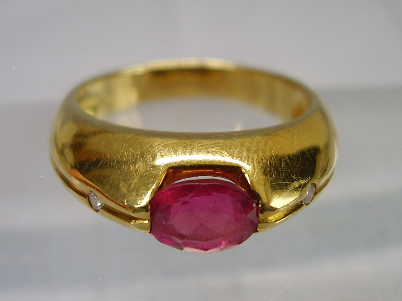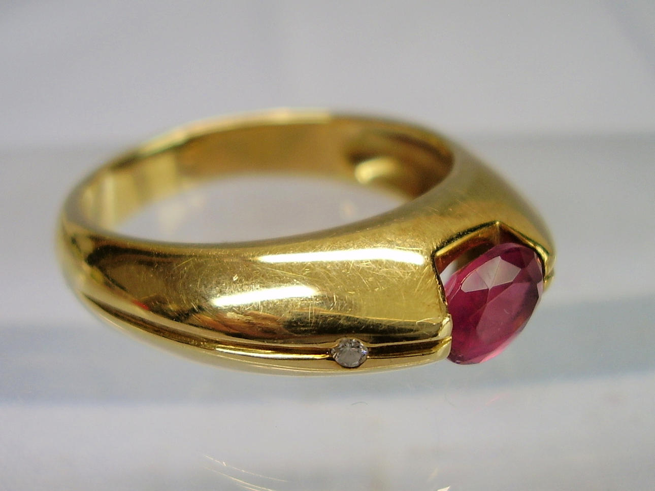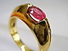 Den solidt tillverkade ringen är gjord av 585 = 14 karat gult guld och är också stämplad som sådan. Ringhuvudet är inställt med en oval fasetterad rubin i naturlig färg och mycket vacker glans.