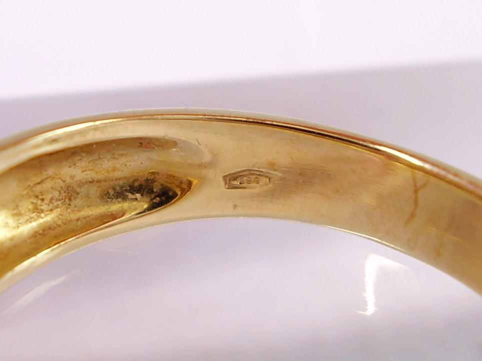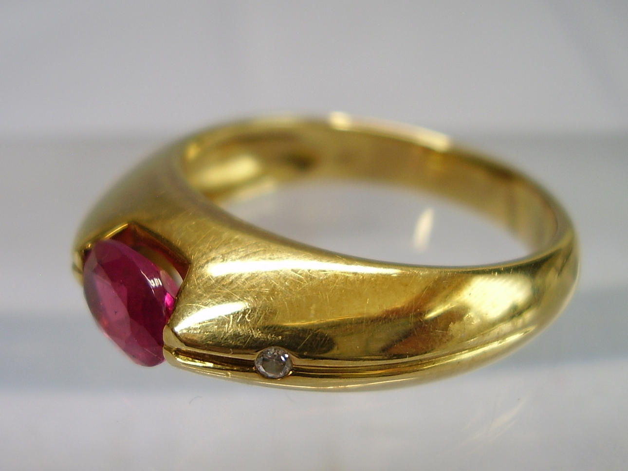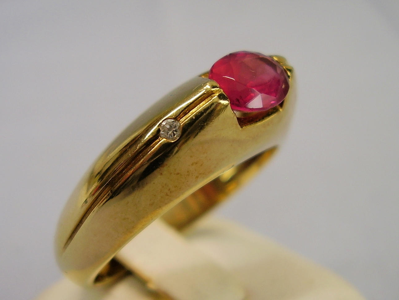 Den solidt tillverkade ringen är gjord av 585 = 14 karat gult guld och är också stämplad som sådan. Ringhuvudet är inställt med en oval fasetterad rubin i naturlig färg och mycket vacker glans.