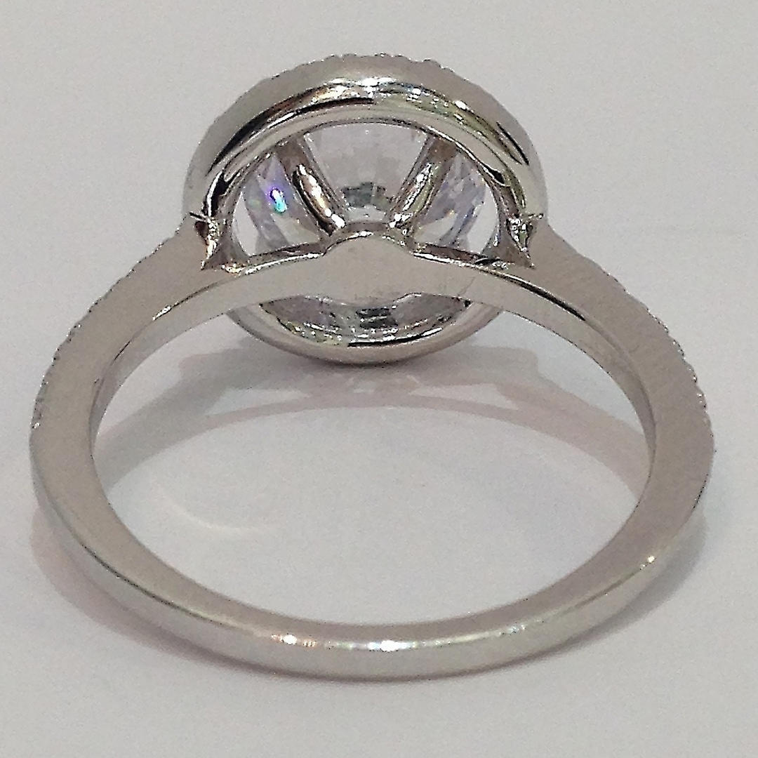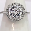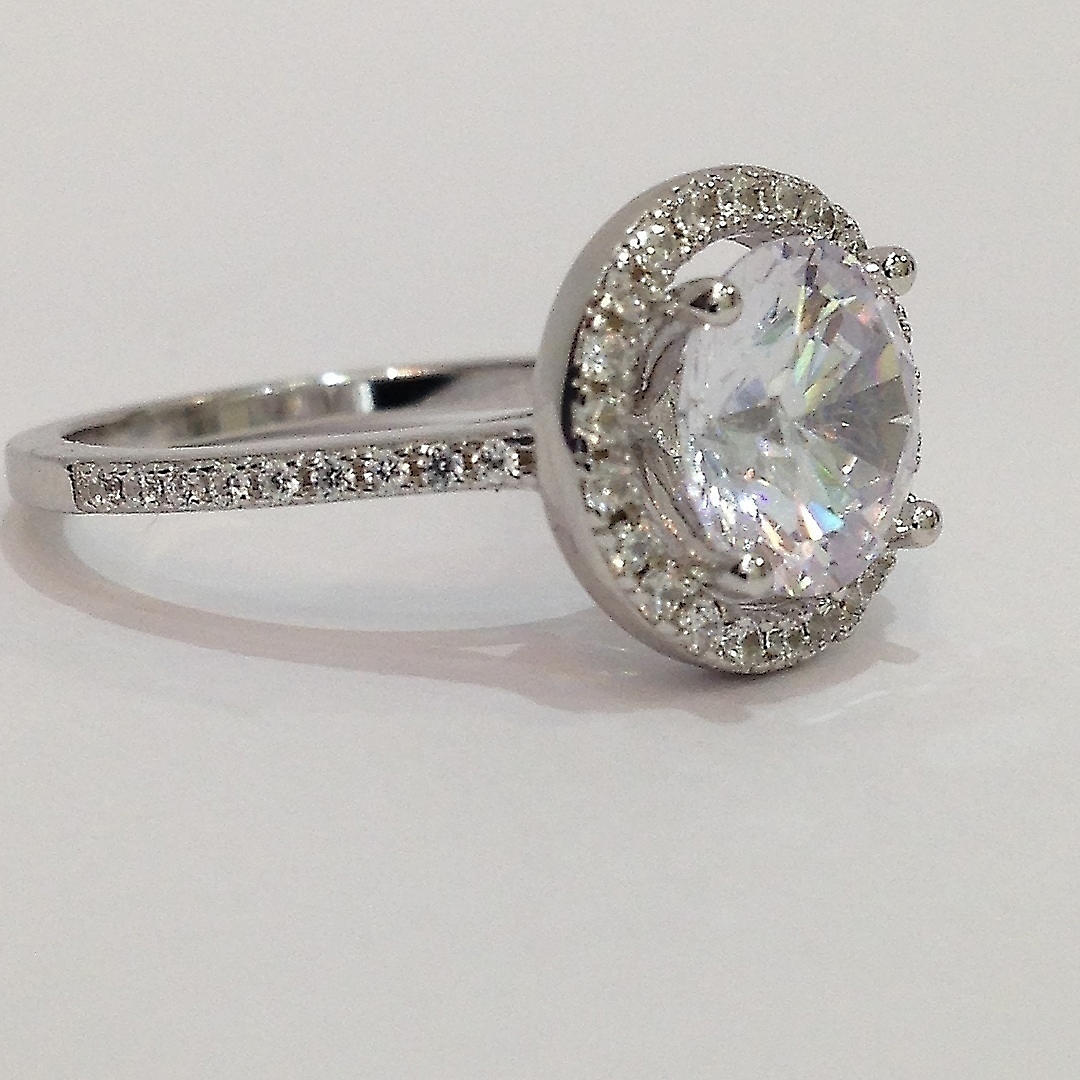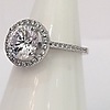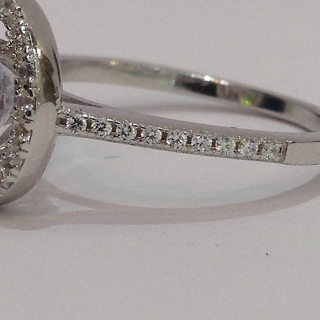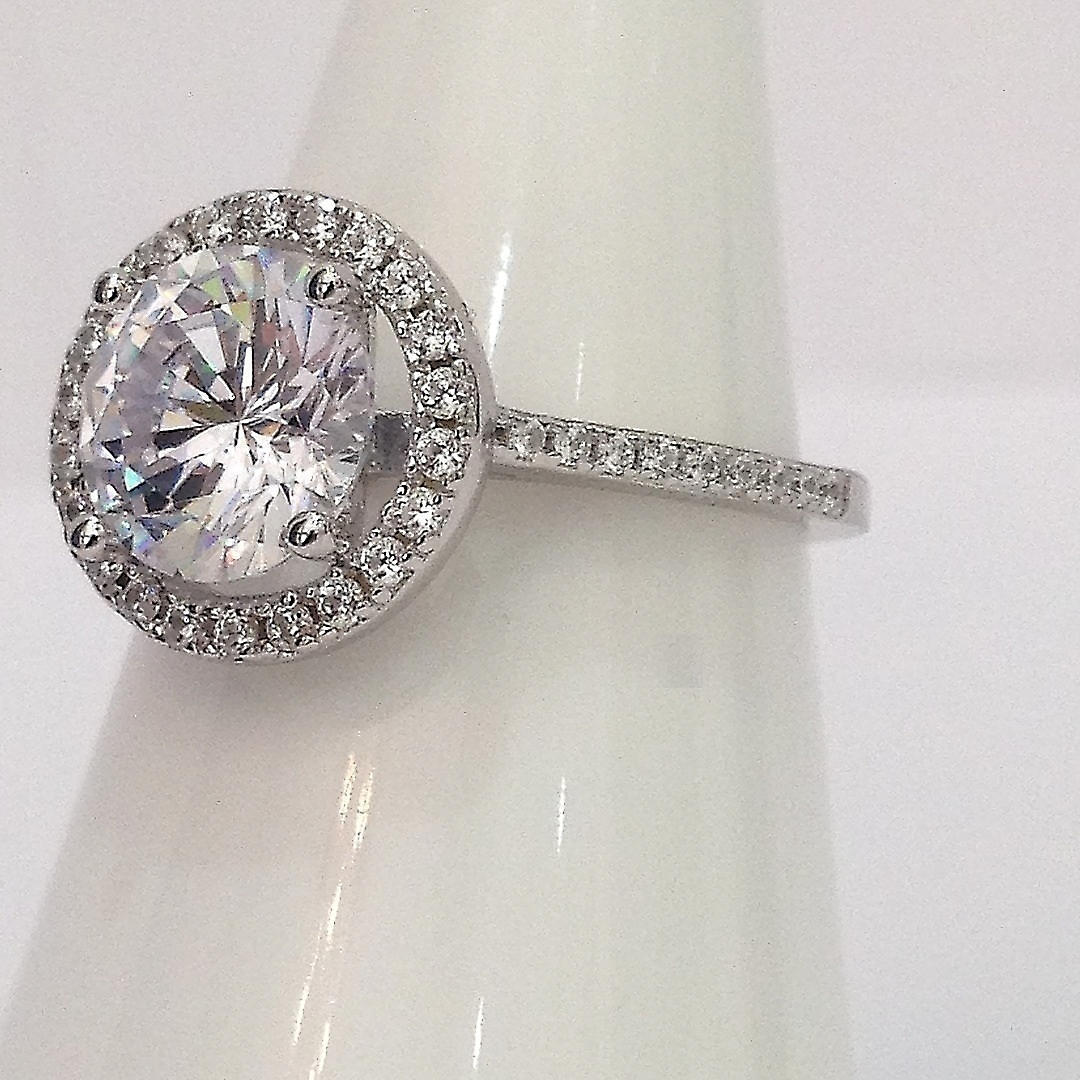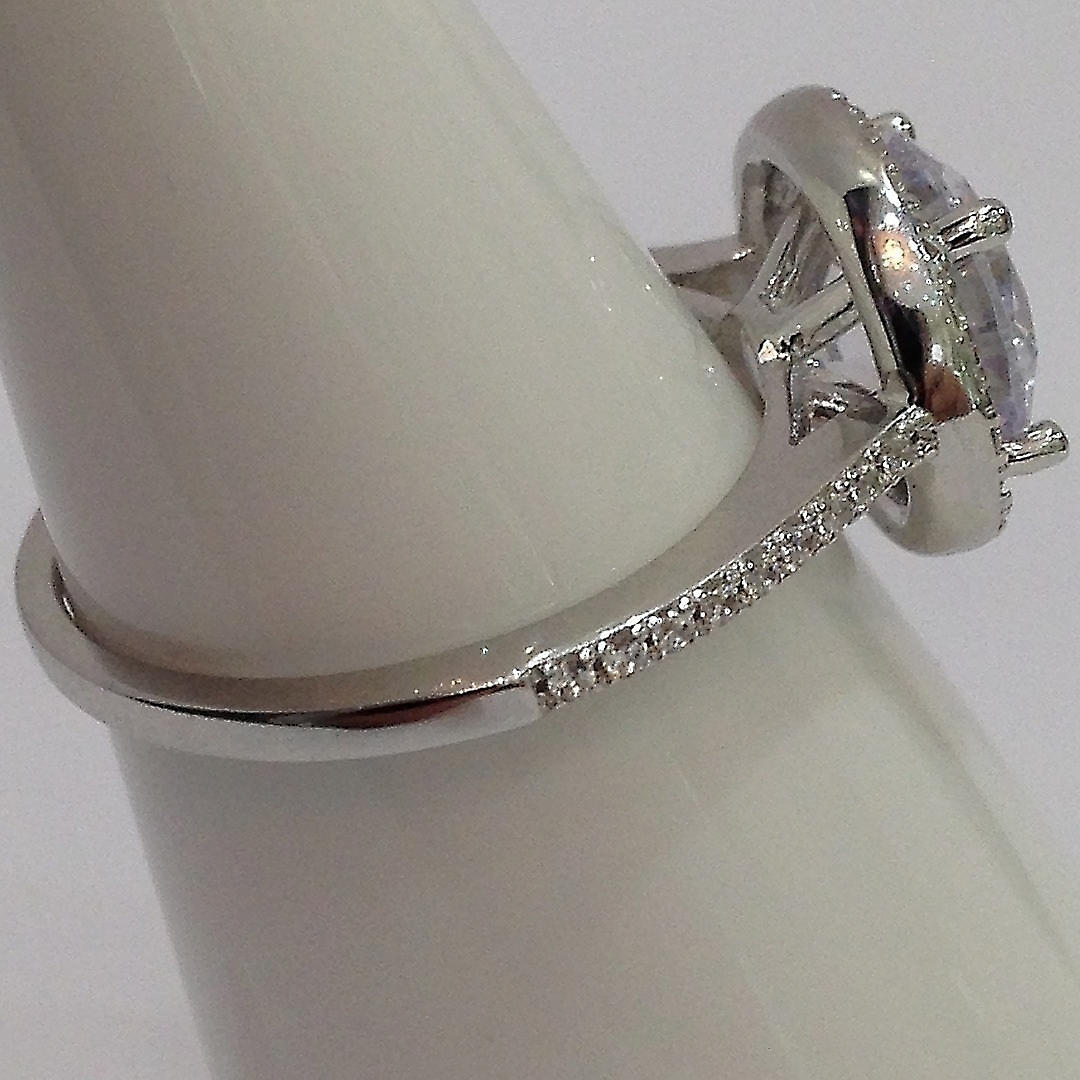 Omkring denna mittsten är en gloria av mindre, vita, runda, briljantslipade cubic zirconia stenar.