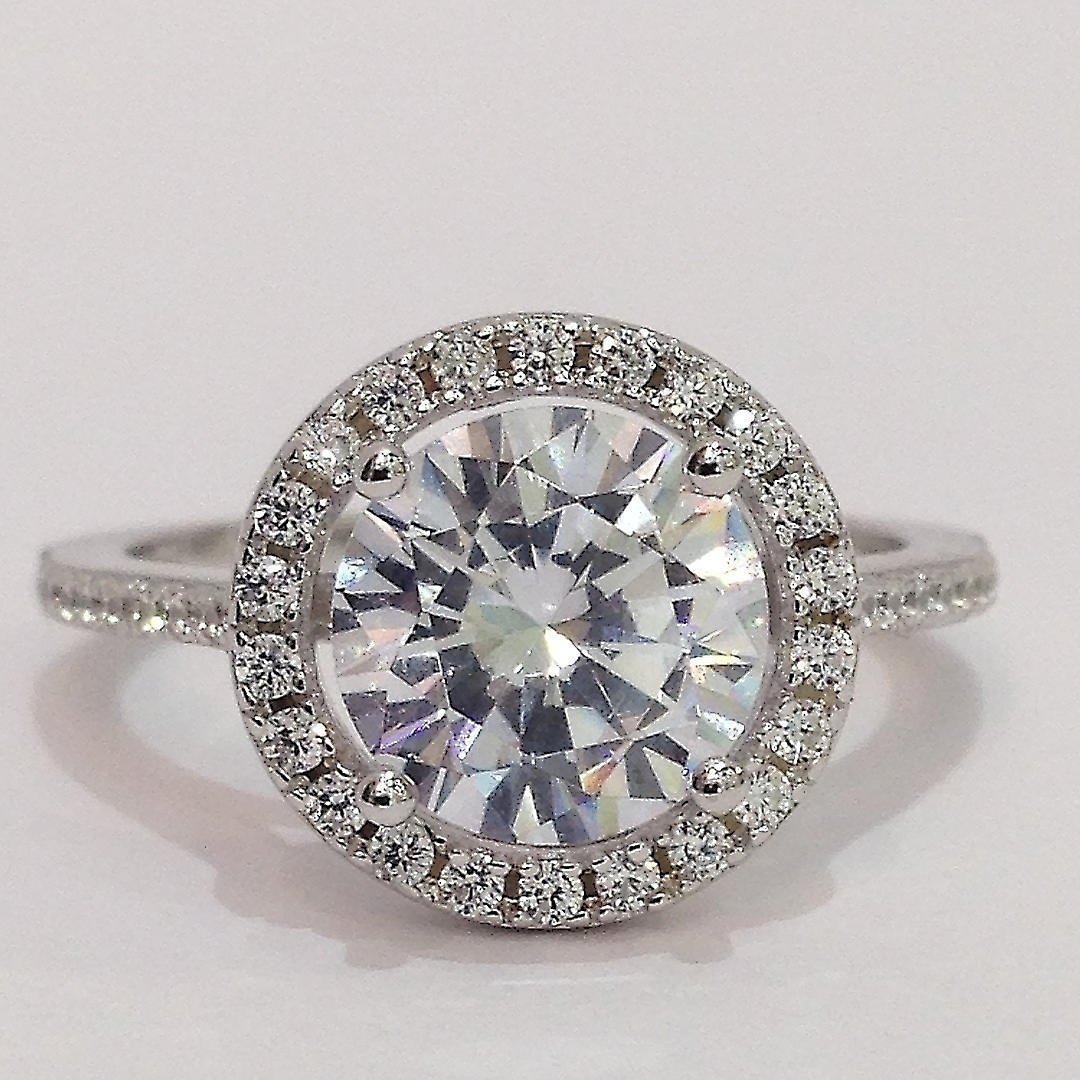 En stor, vit, rund, briljantslipad cubic zirconia sten ligger i mitten av denna ring.