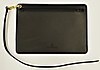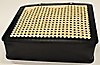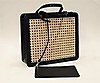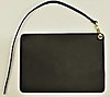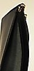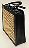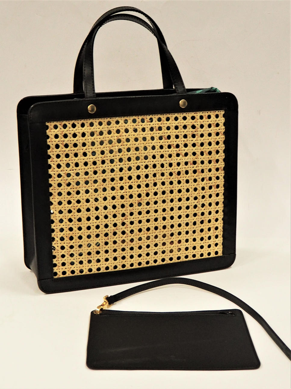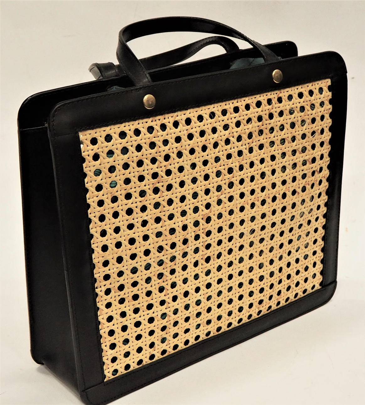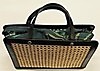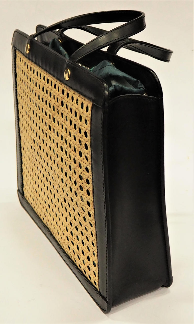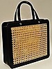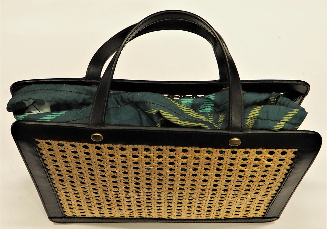 Handväska i vegetabiliskt garvat svart läder med fram- och baksida i naturfärgat rotting. Insida med litet fack på kortsida. Fodral, även det i svart skinn, med rem. Innerpåse som fästs i väskans tryckknappar. Väskans mått Längd 31 cm, höjd 27 cm, bredd 9 cm.