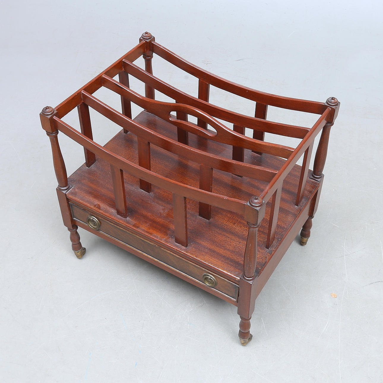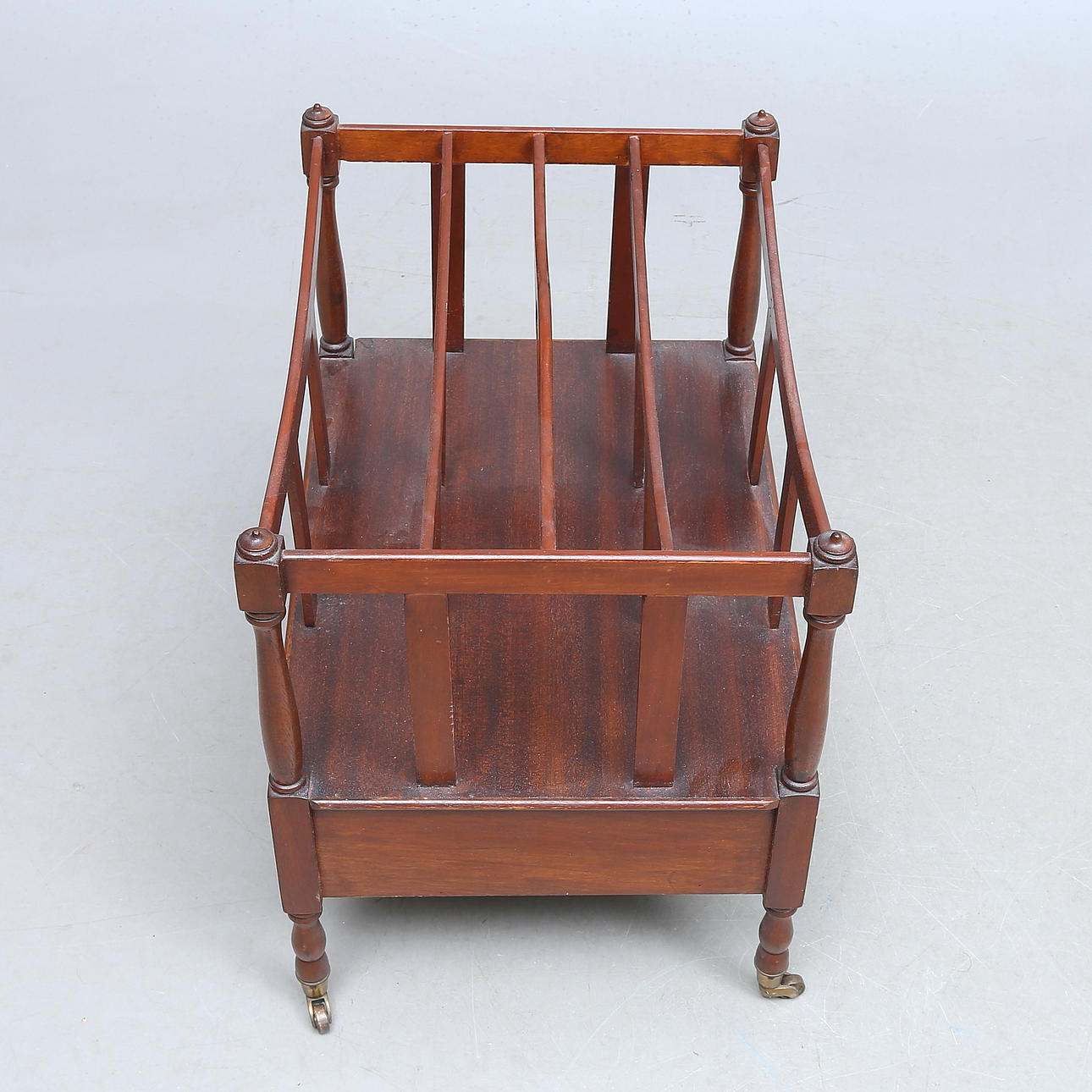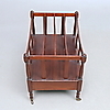 På hjultrissor, med låda. Längd ca 49, bredd 36, höjd ca 48 cm.