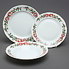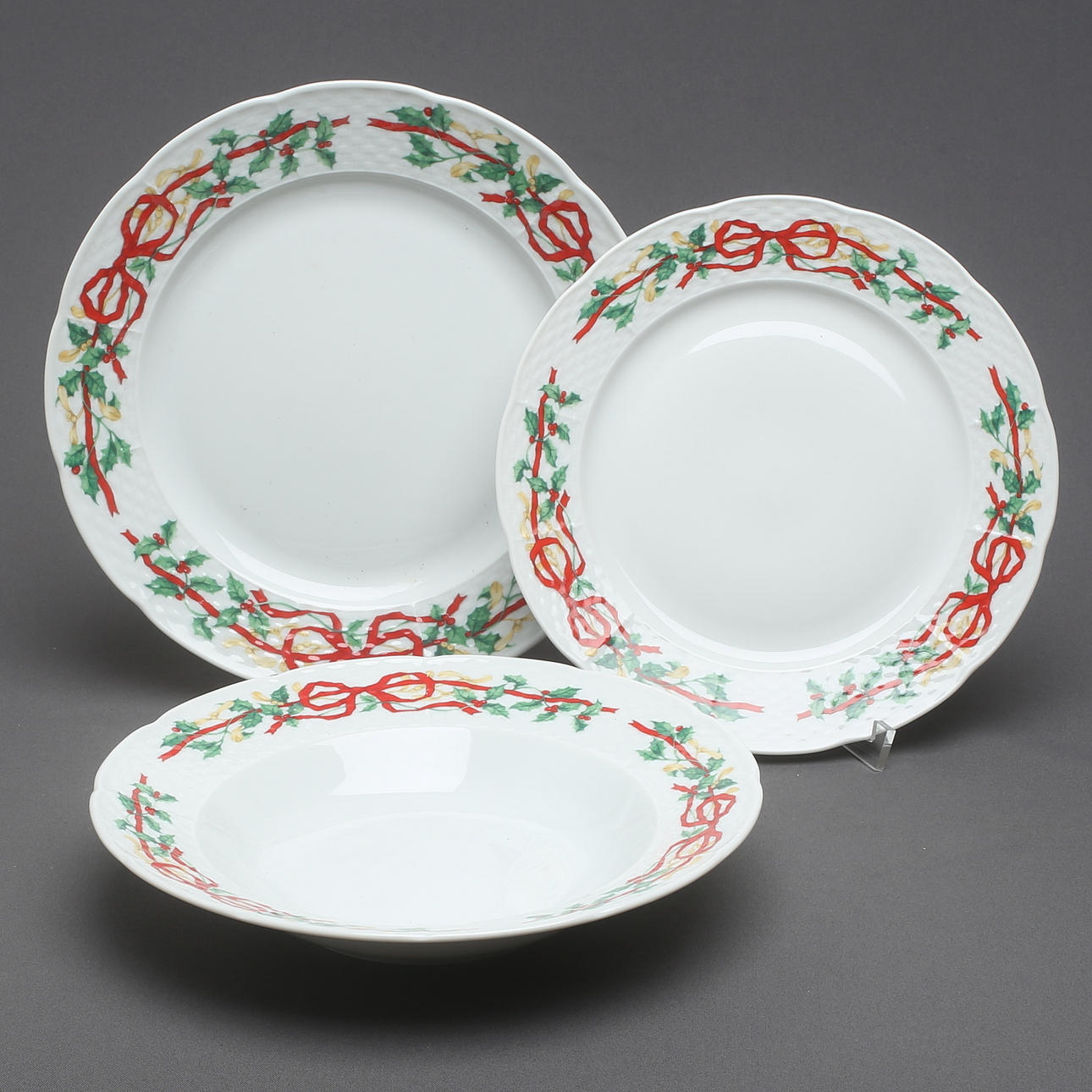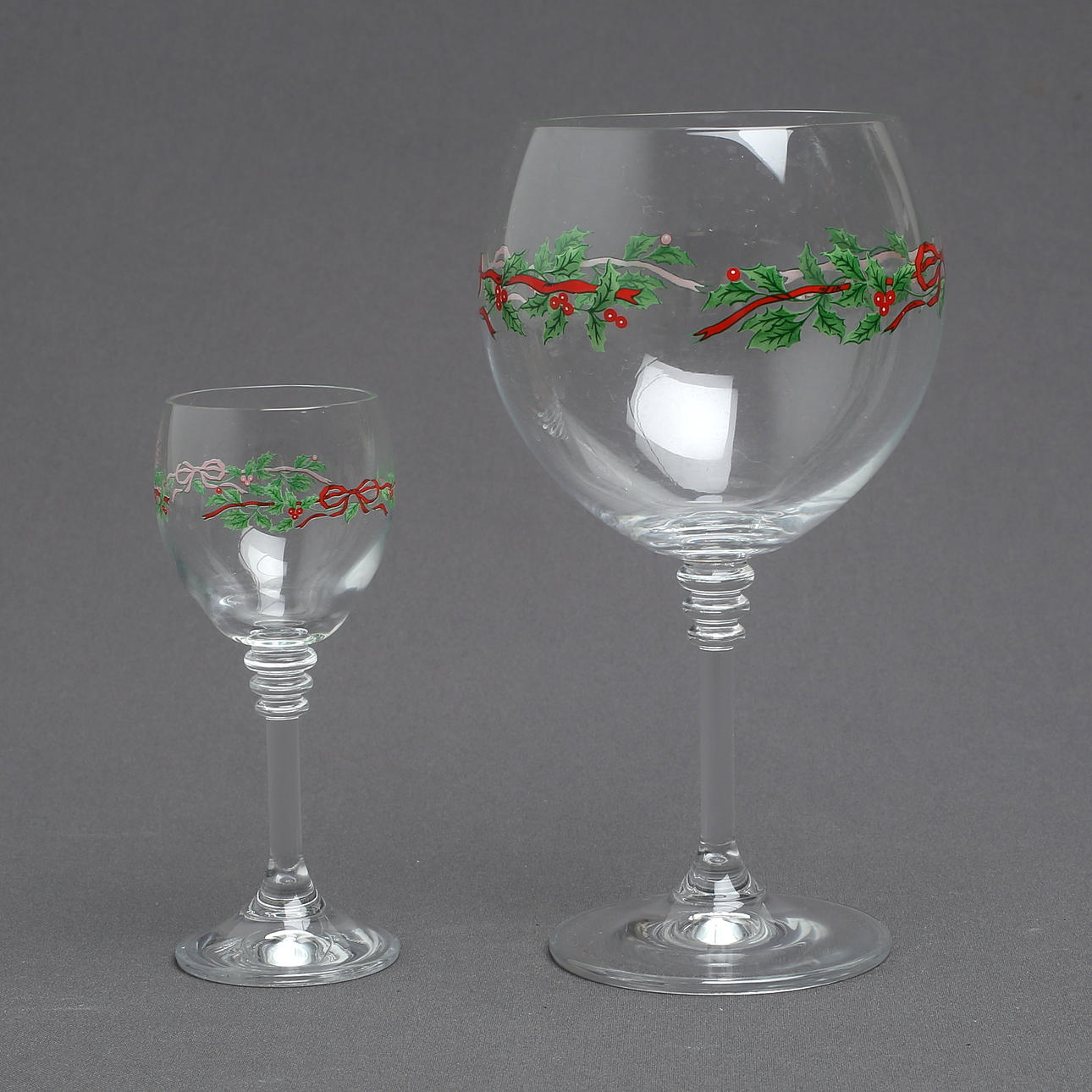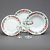 6 vinglas, höjd ca 18 cm. 6 likörglas, 12,5 cm. 5 flata tallrikar, diameter ca 24 cm. 6 assietter, 21 cm. 6 djupa tallrikar, 23 cm.