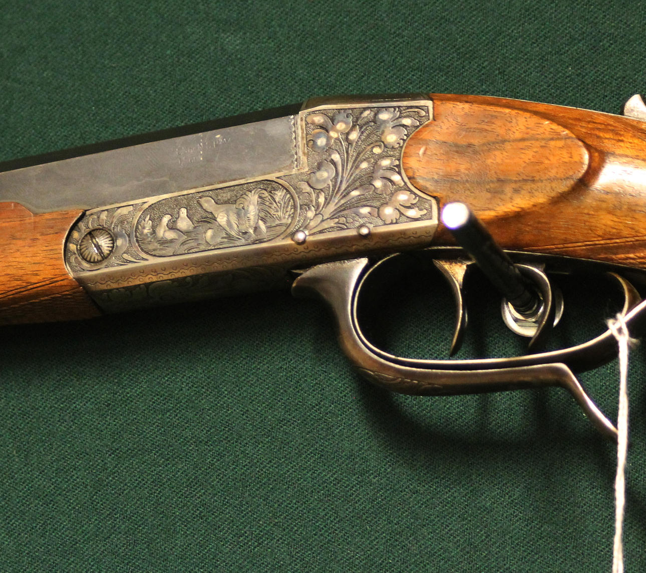 Tillv.nr.527. Piplängd 67cm. Octagonal pipa. Klaffsikte . Öppningsvred under varbygel. Flamhärdad baskyl med riklig gravyr. Snälltryck med dubbla avtryckare. Säkring på kolvhals. Kolv med pistolgrepp och kindströd.