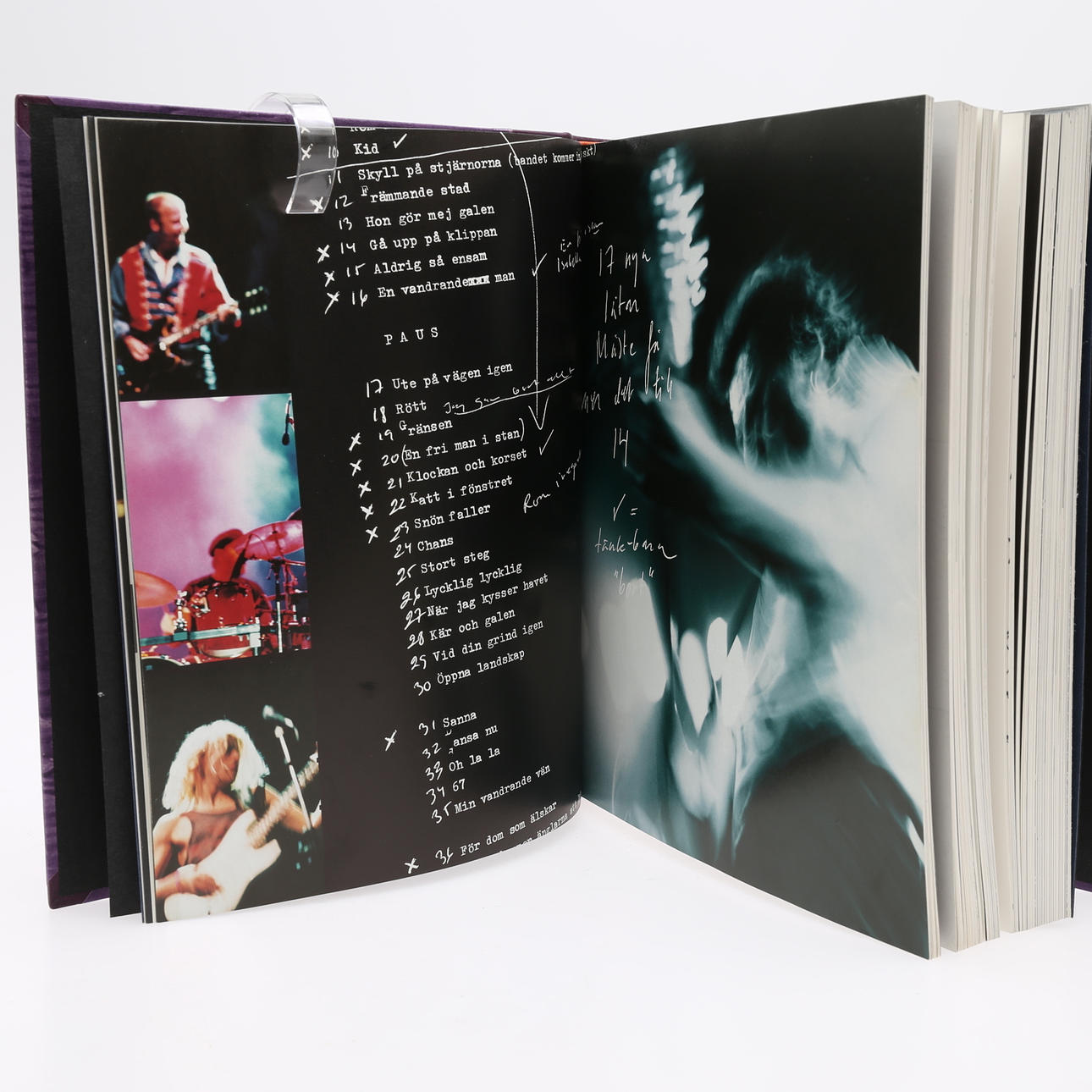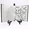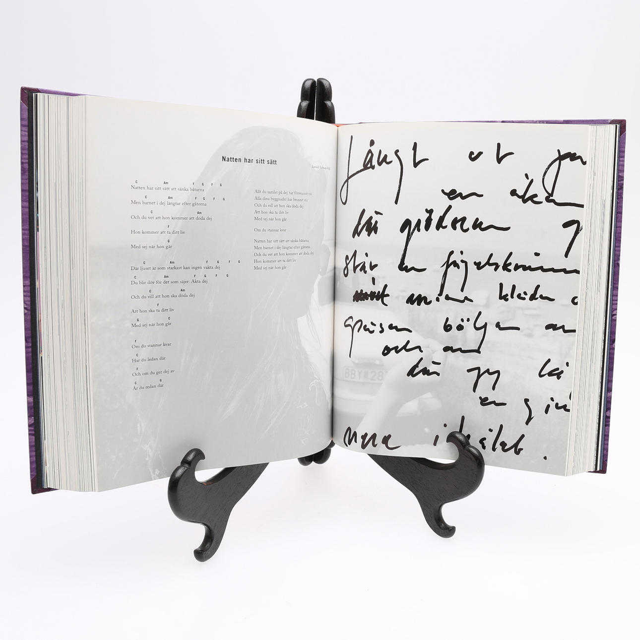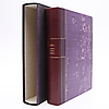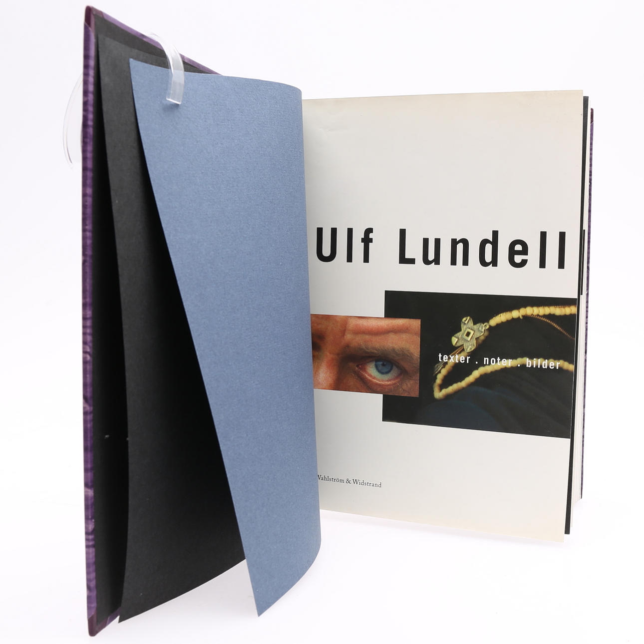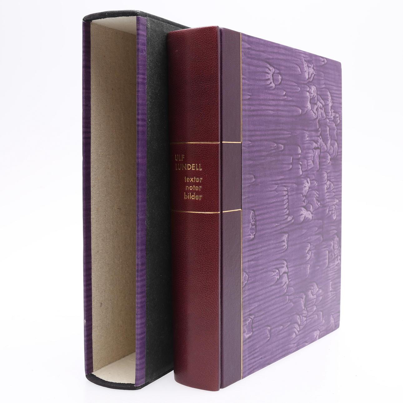 Lundell, Ulf, svensk musiker & författare & konstnär, född 1949. Ulf Lundell. Texter - noter - bilder. Wahlström & Widstrand., Stockholm, 1998. Stor 4:o i ett lila halvmarokängband med förgylld ryggtext, sparsmakat förgylld dekor och marmorerade pärmar. Silvrigt övre snitt. Omslagen medbundna. Ett genomillustrerat magnum opus av Ulf Lundells texter, bilder och musik. Förvaras i en välgjord fodrad kassett. 660 sid. + monterad konstnärlig plansch.