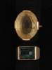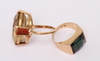 Ring med grön slipad sten, stmpl 750 samt import, strl ca 15. Ring med gul slipad sten, stmpl STA Ludvika, strl ca 16.