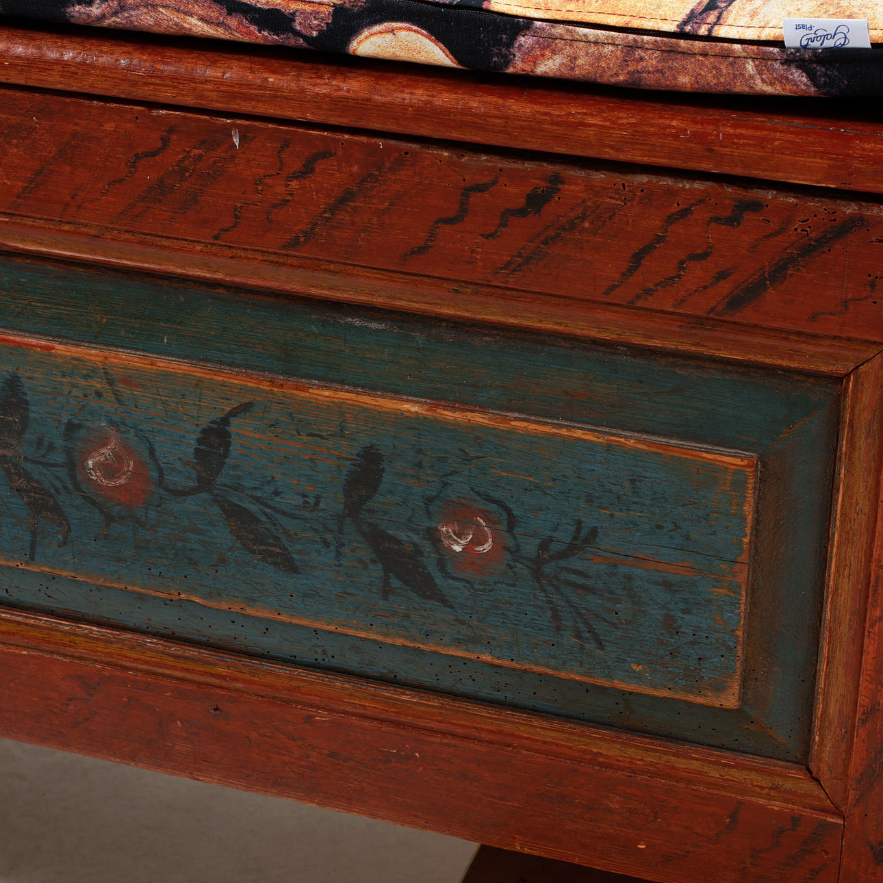 Furu med bemålad träimitation och dekor av stiliserade blommor. Lös sits och dyna. Längd ca 163 cm, sitthöjd ca 47 cm, sittdjup ca 47 cm.