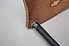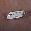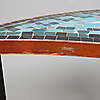Svärtade ben med dekor av mässing. Skiva fanerad med teak och dekor av mosaik. Längd ca 74. Bredd 35. Höjd 51 cm.