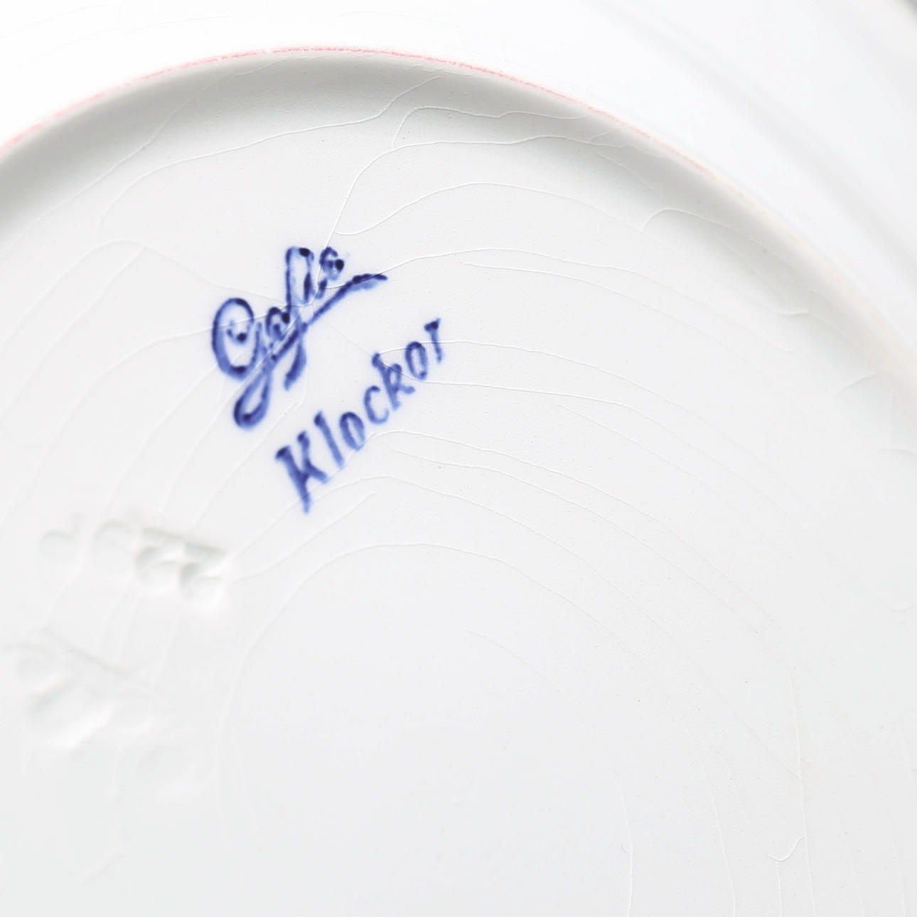 Krackelyrer, smärre missfärgningar. Enstaka nagg/ skrap kan förekomma.