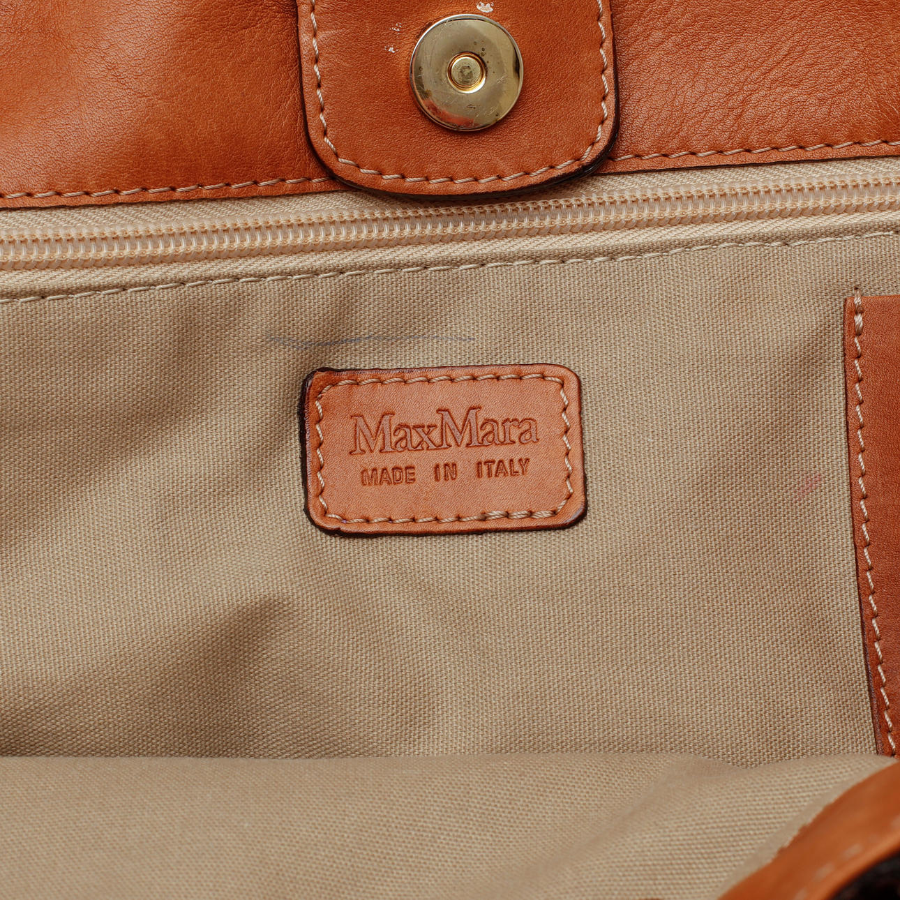 Ljusbrunt läder med detaljer i guldfärgad metall. Fodrad. Två innerfickor, varav en med dragkedja.