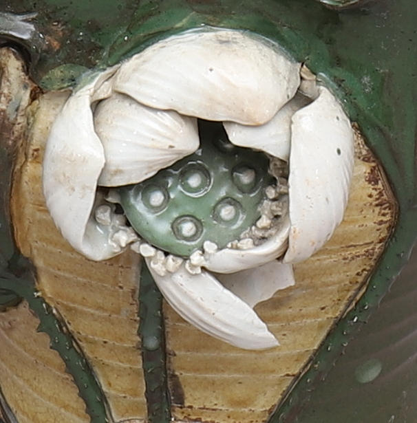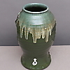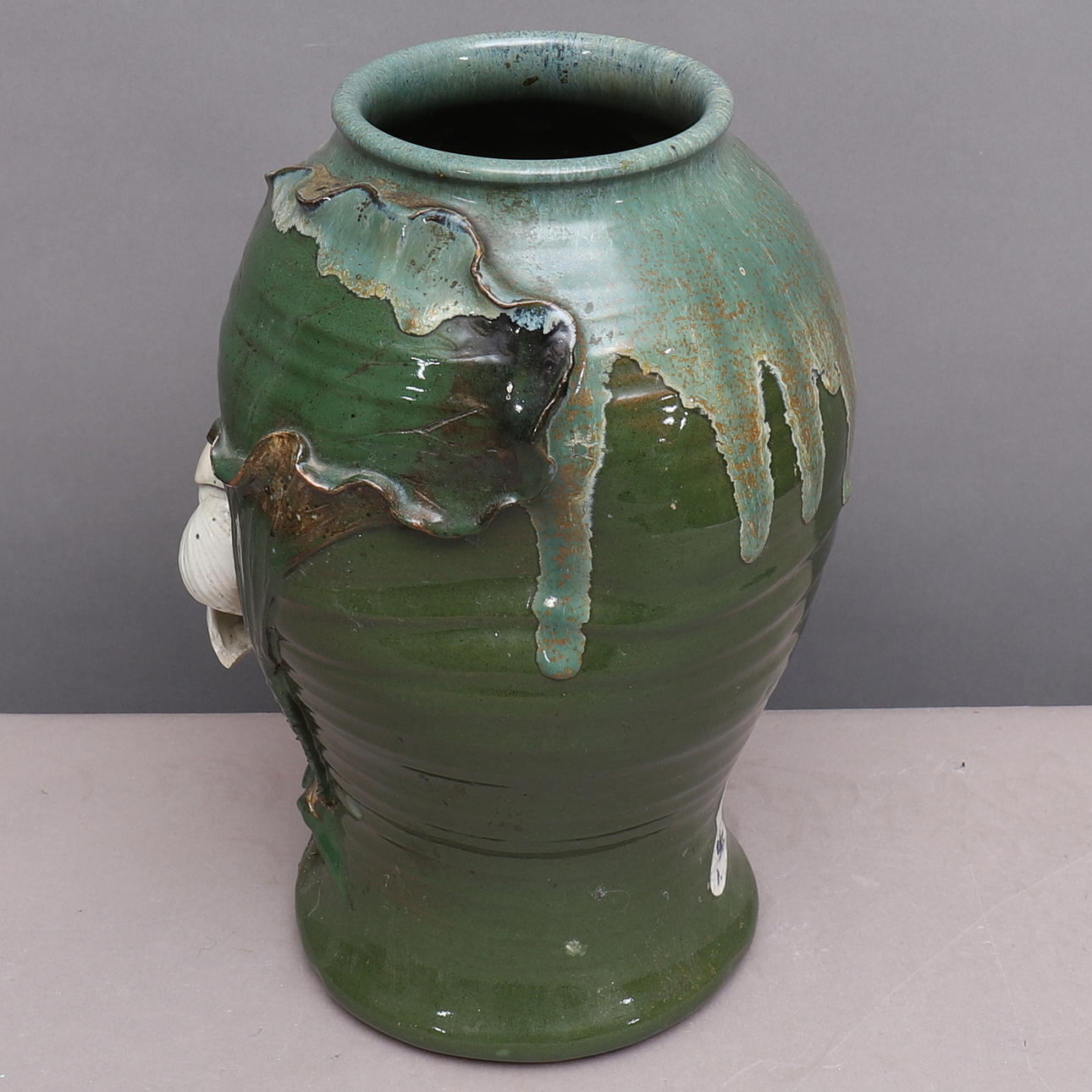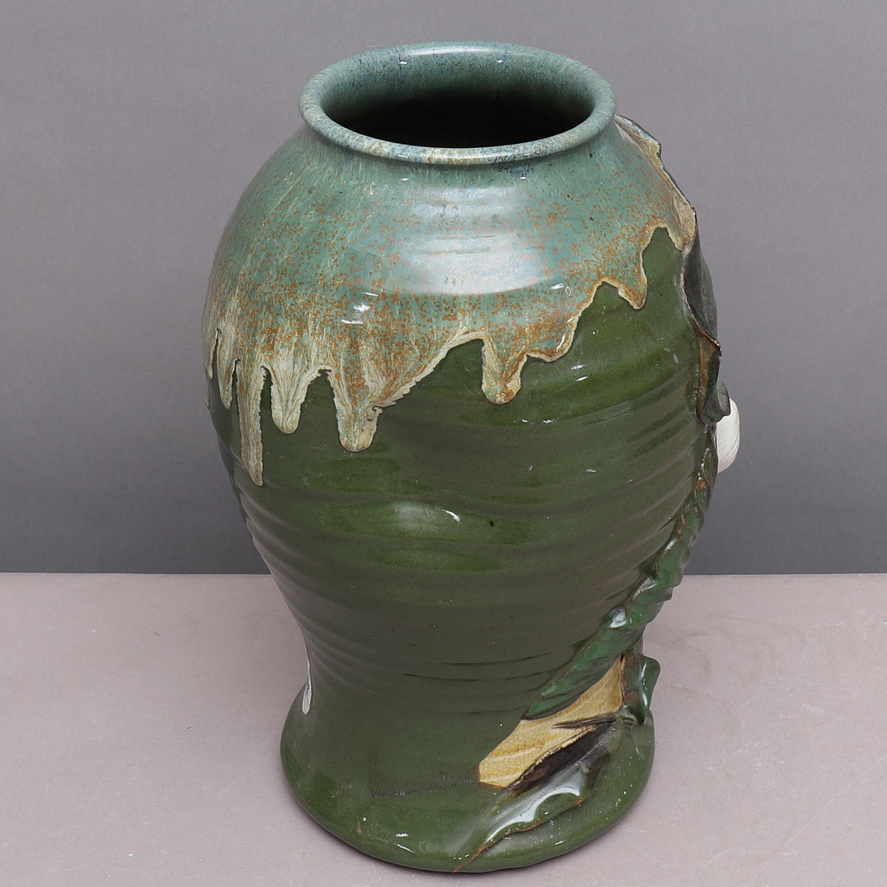 Reliefdekor. Ojämn form, som tilltryckt på sidorna. Ca 32 cm hög.