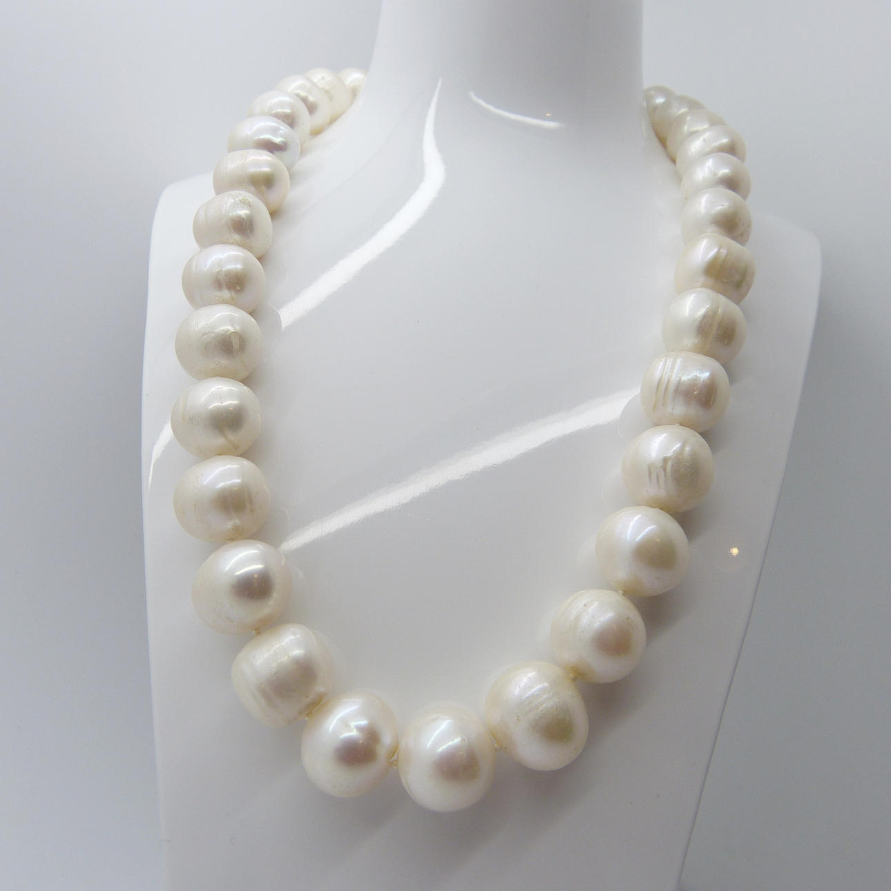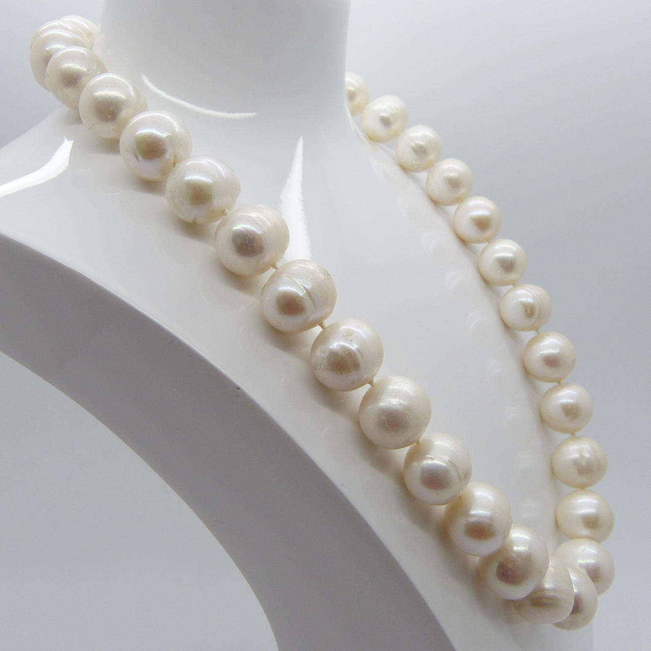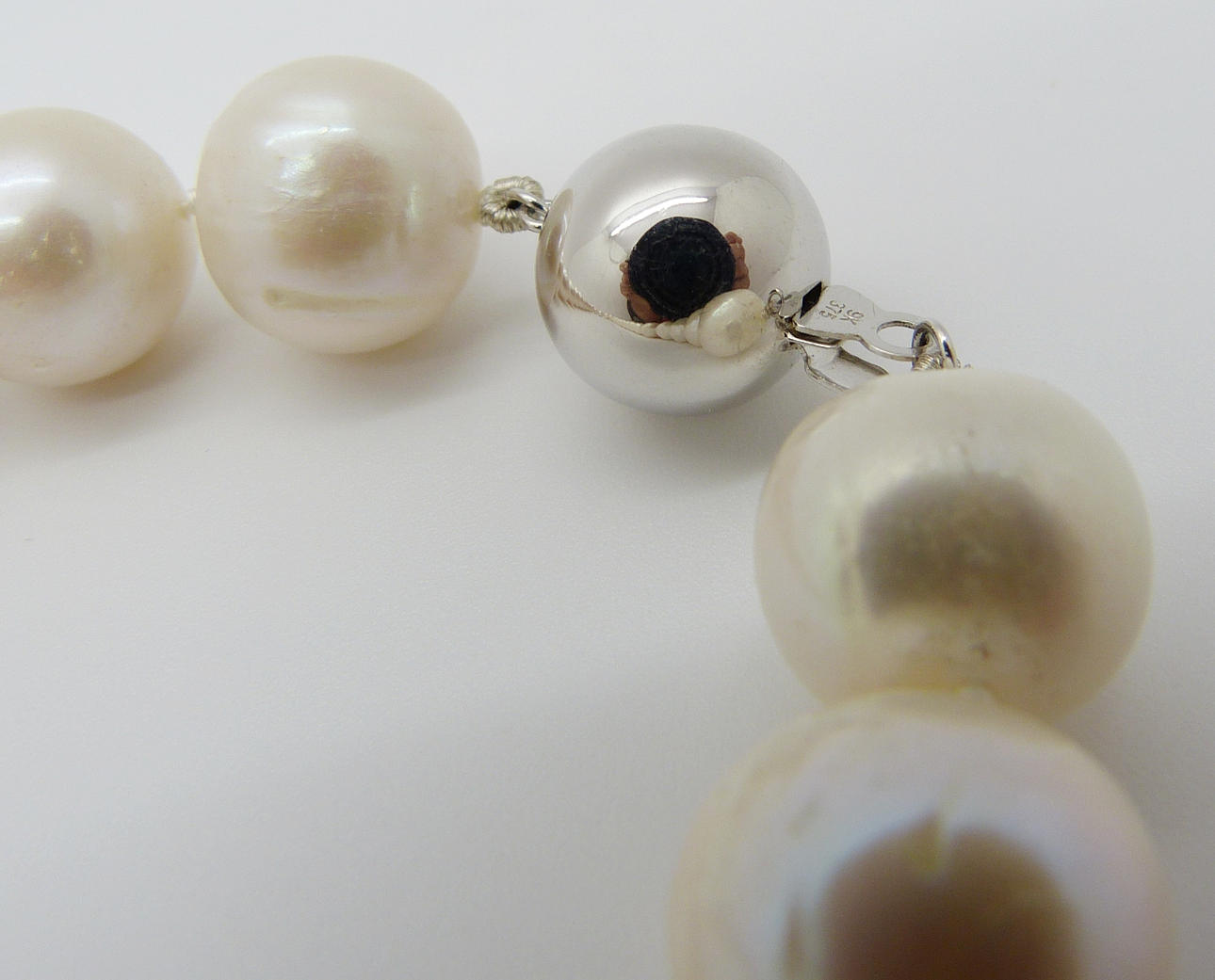 De graderade odlade pärlorna i detta halsband varierar i diameter från 12 - 16 mm, ca.