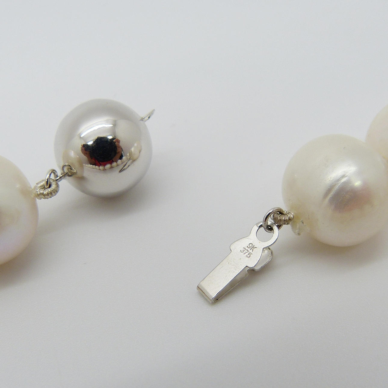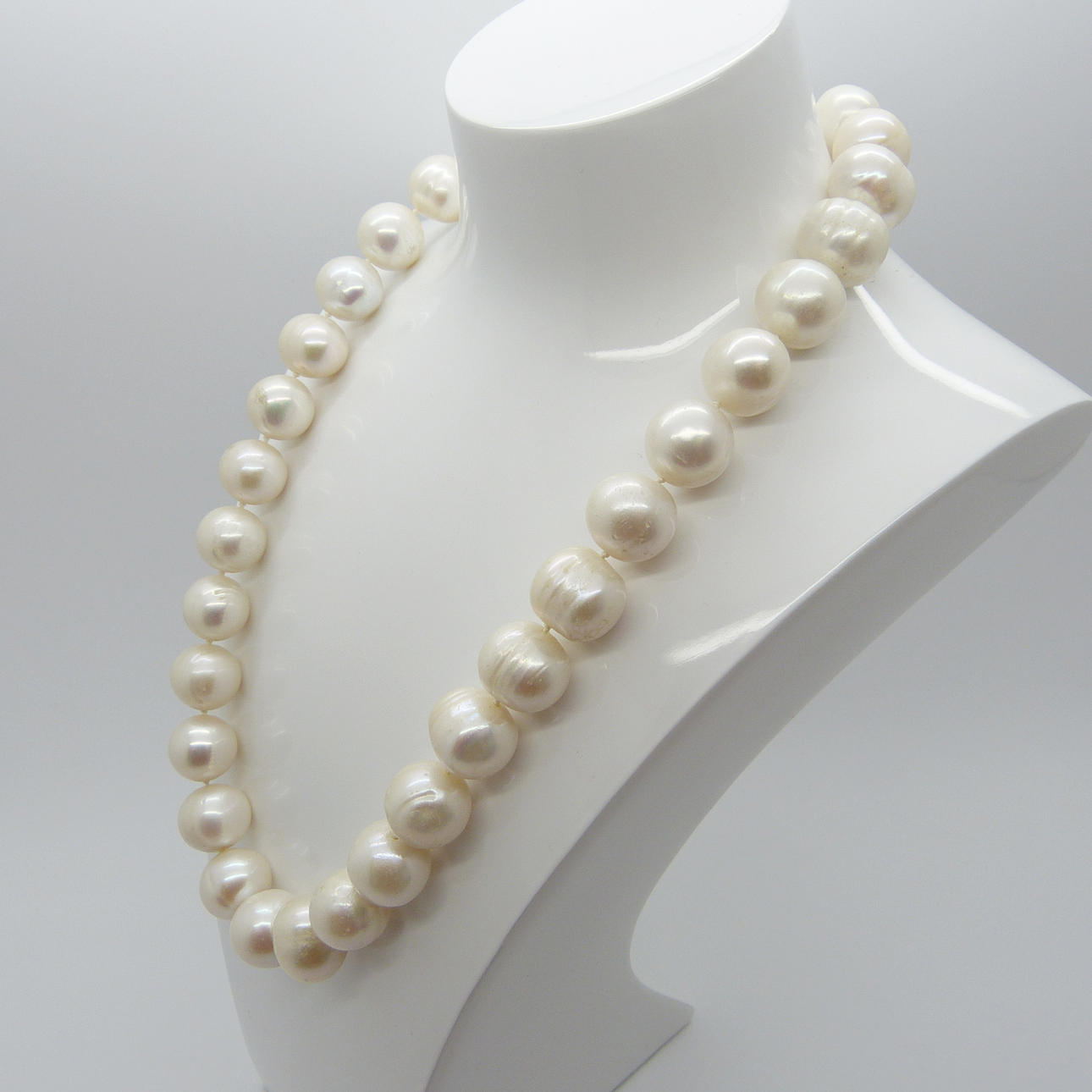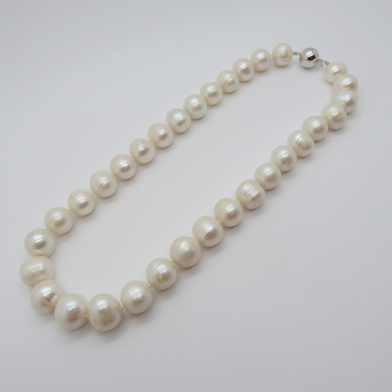 De graderade odlade pärlorna i detta halsband varierar i diameter från 12 - 16 mm, ca.