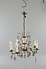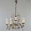 Ljuskrona med stomme i gulmetall, behängd med droppformade prismor, fem ljuskällor