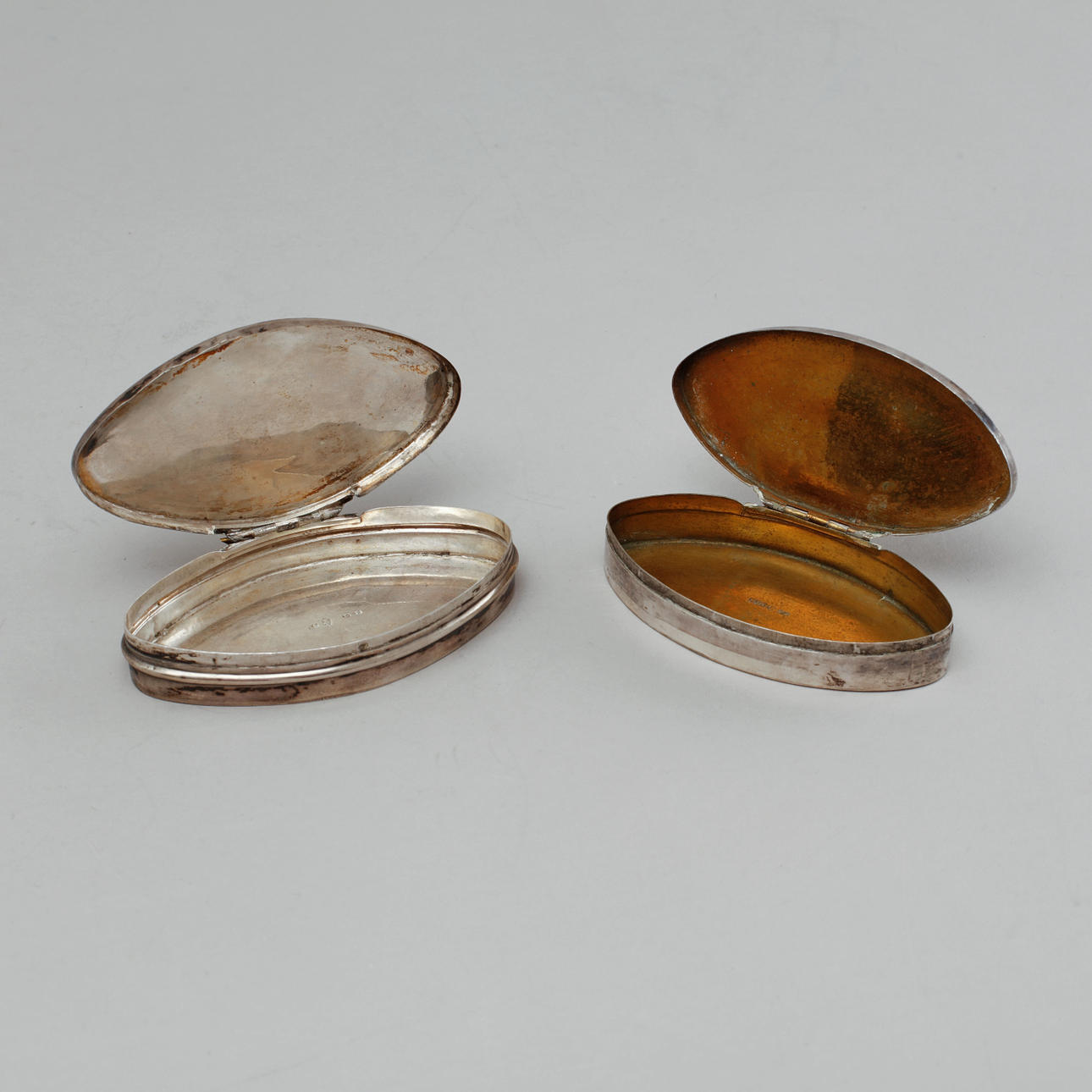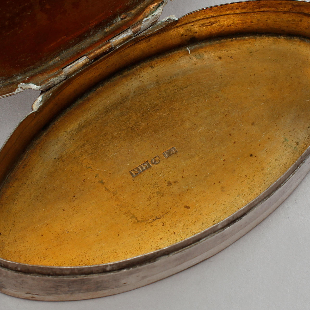 Mindre skador och åldersrelaterat slitage. En dosa med äldre dediktation på undersidan.