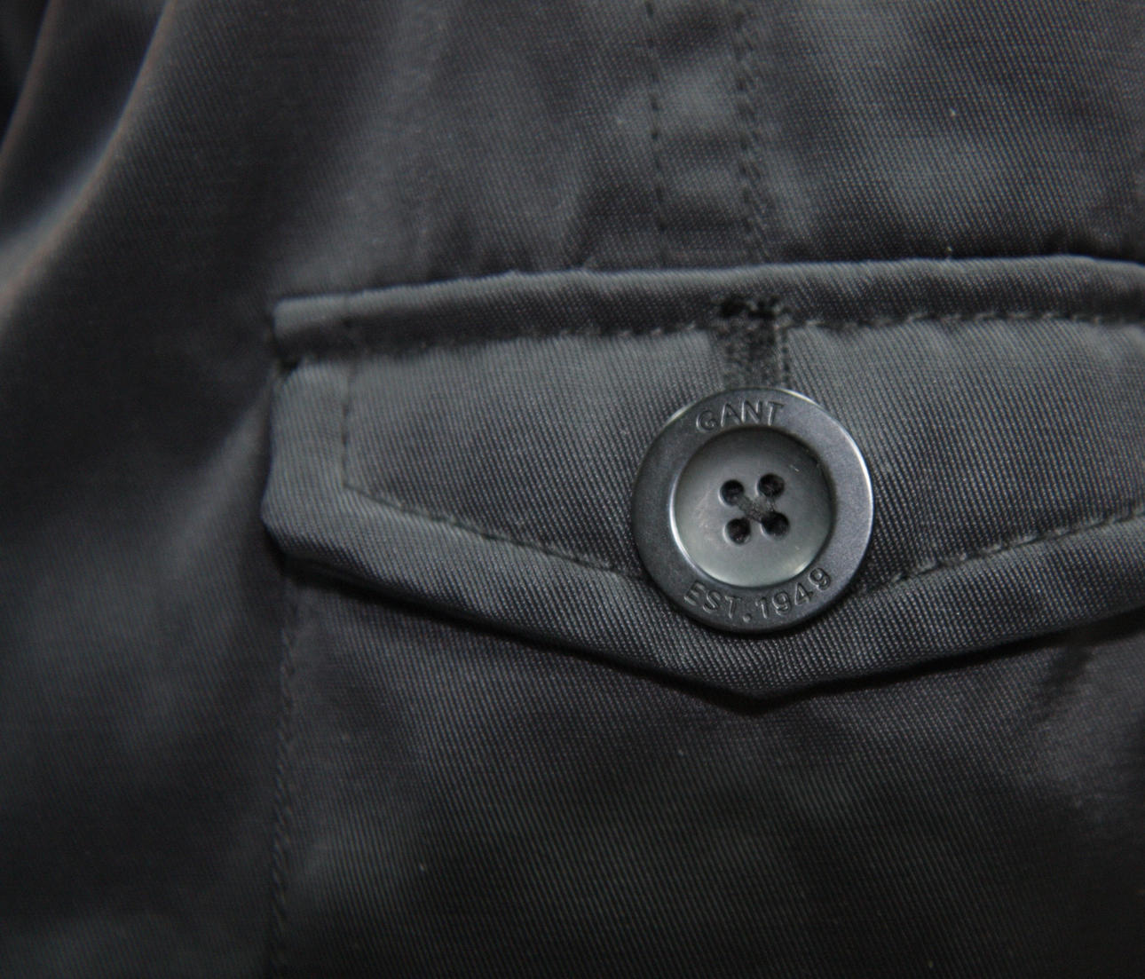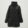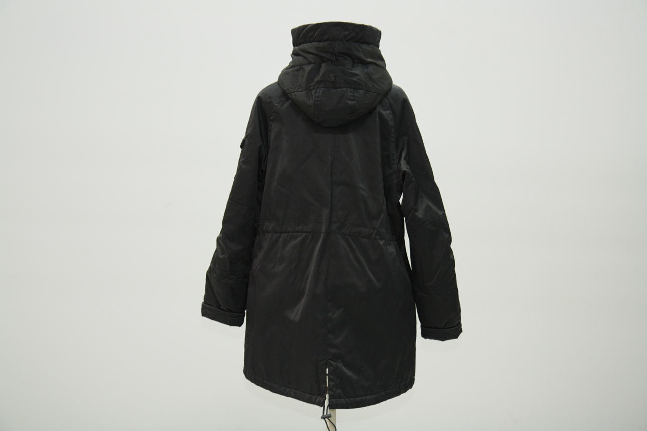Fuskpälsfodrad kapuschong, knappar och dragkedja, % utanpåfickor, dragsko i midja, 65% polyamid 35% bomull.