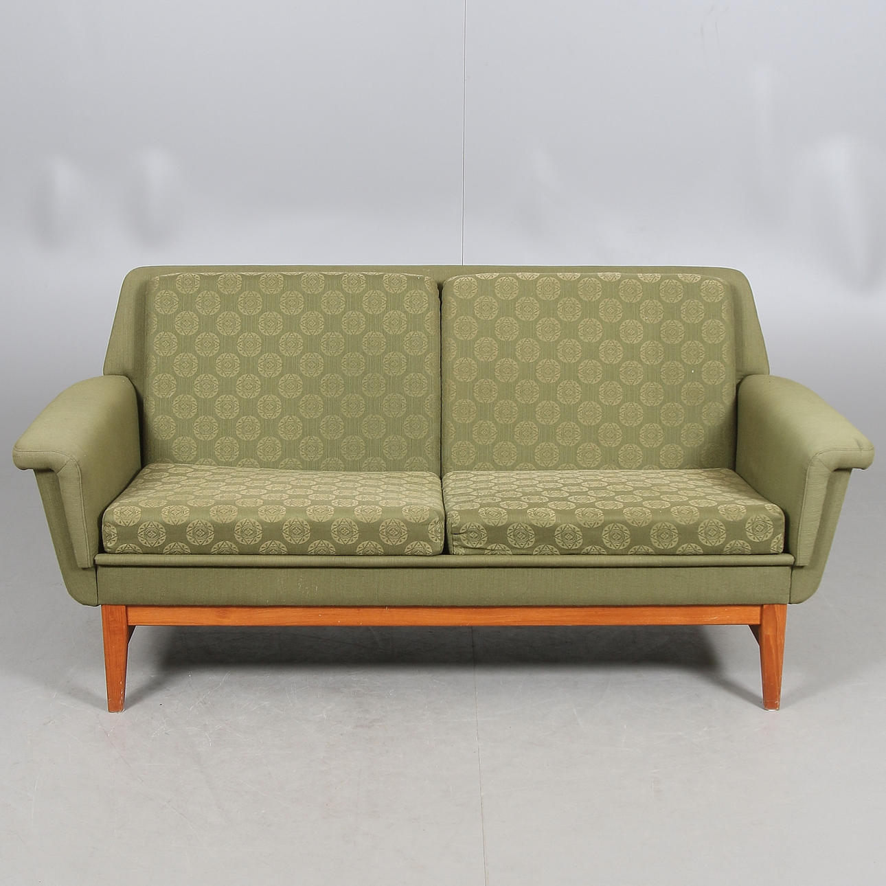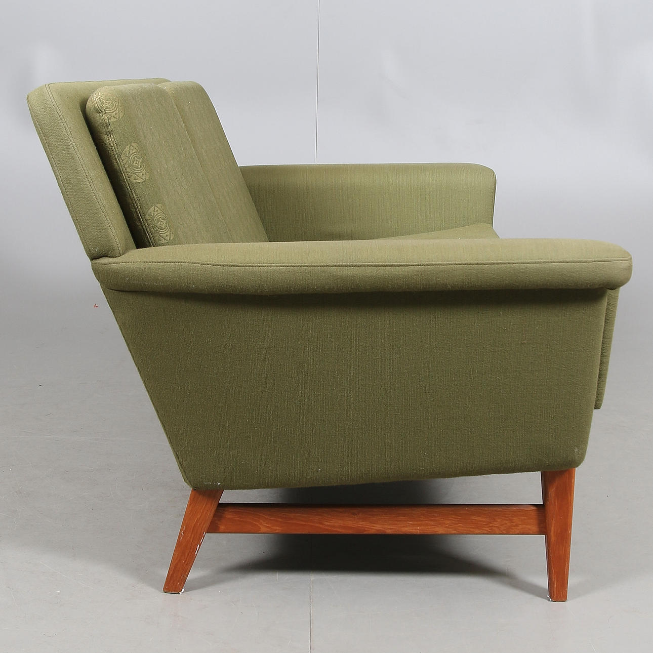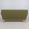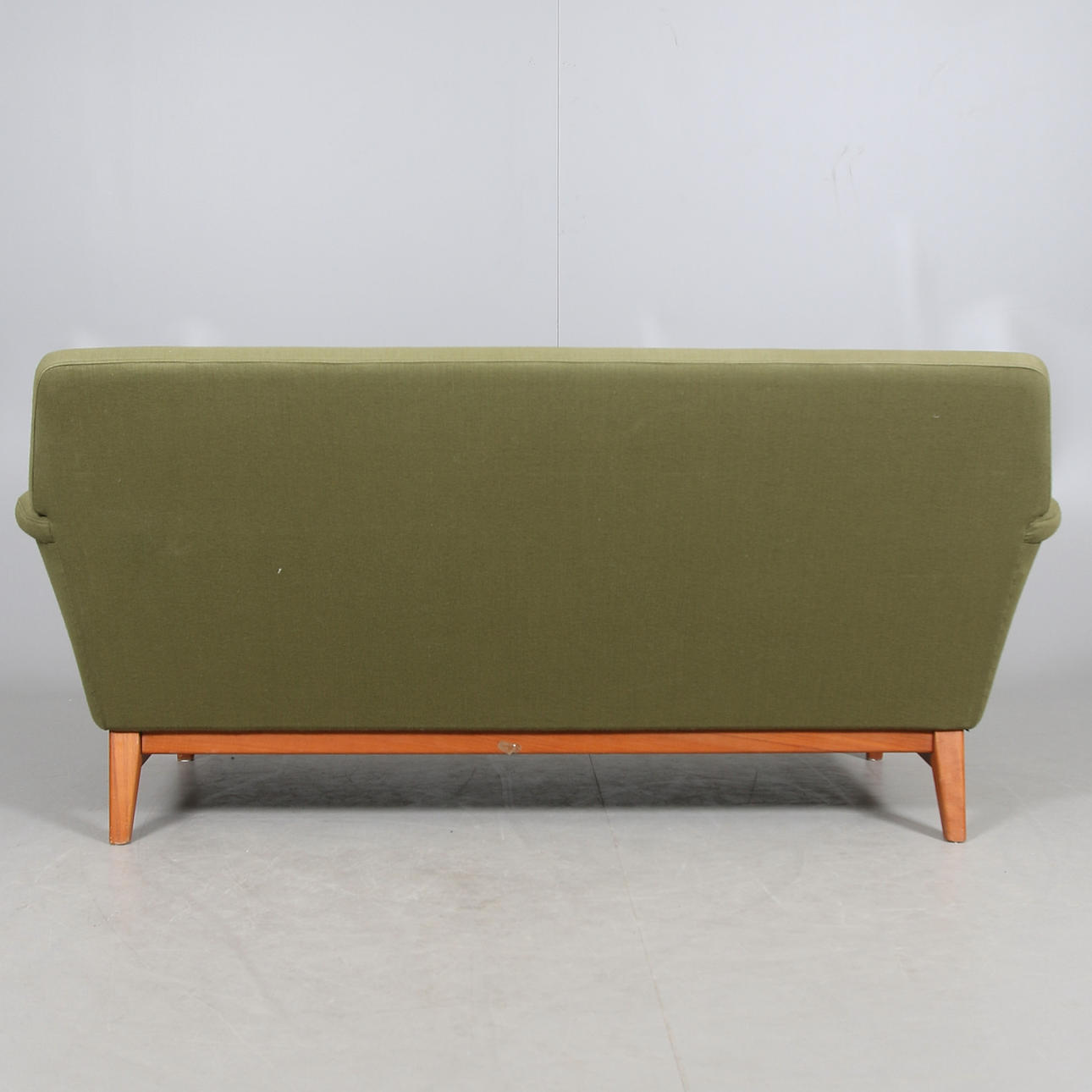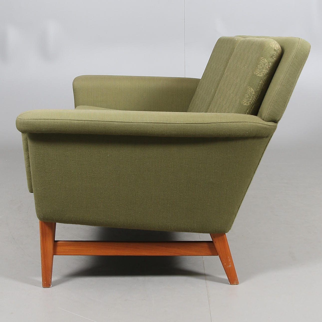 Stomme av teak. Stoppad rygg och sits med lösa plymåer, klädd i grön textil. Soffa, längd 152, bredd 75, rygghöjd 74 cm.