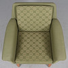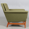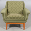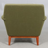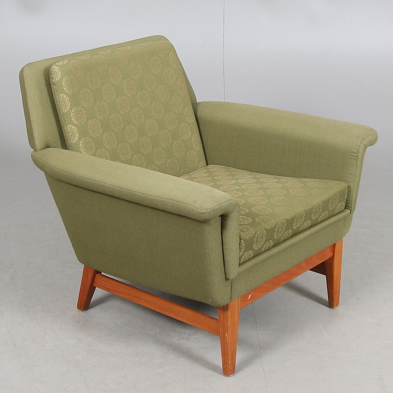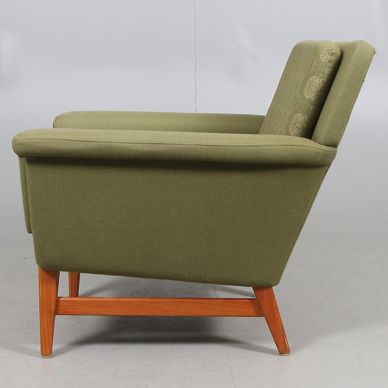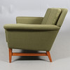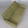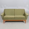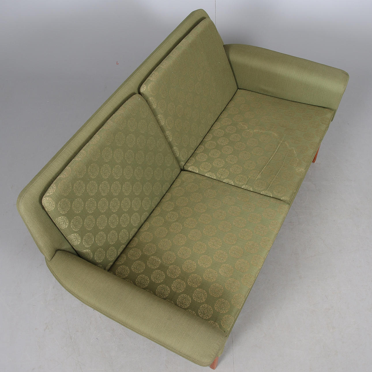 Stomme av teak. Stoppad rygg och sits med lösa plymåer, klädd i grön textil. Soffa, längd 152, bredd 75, rygghöjd 74 cm.