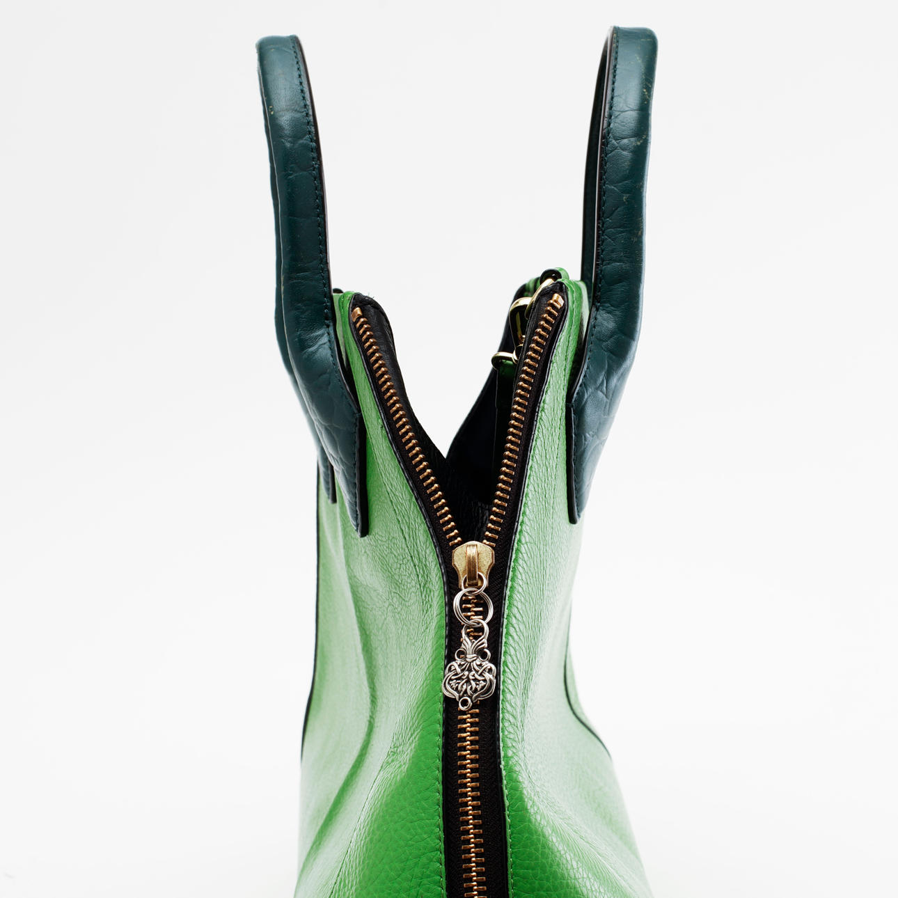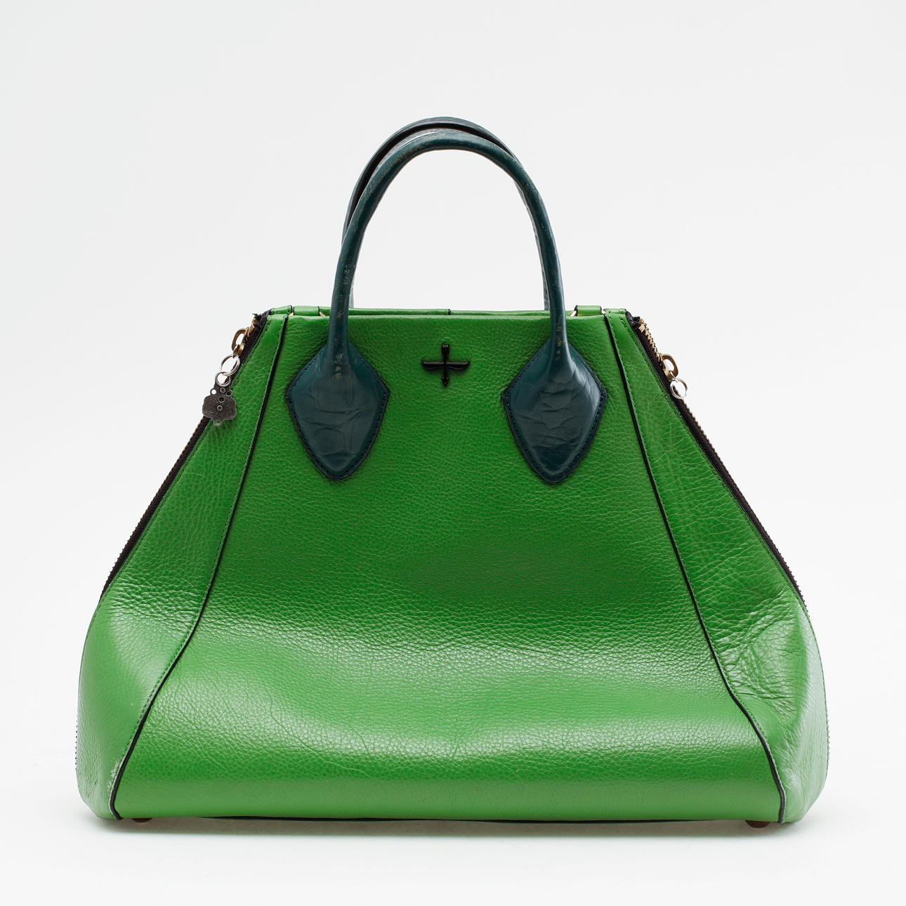 Trapetsformad väska i läder, äppelgrön färg. Märkt: "Pour la Victoire".