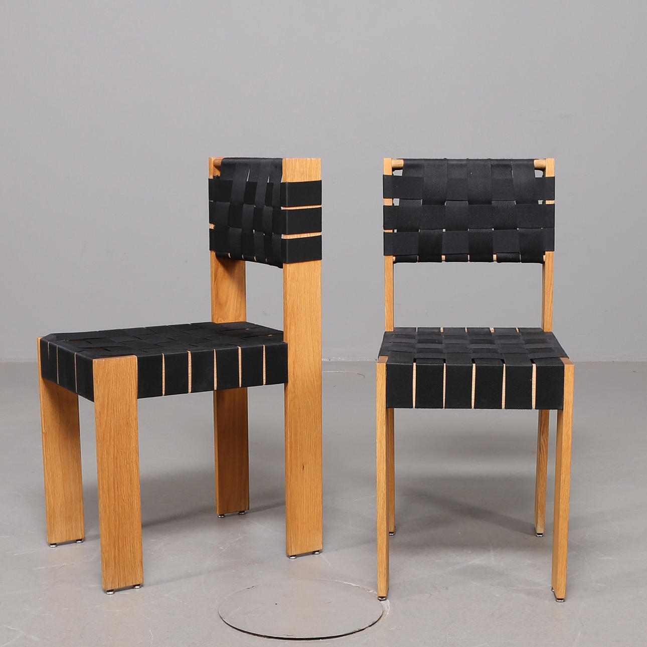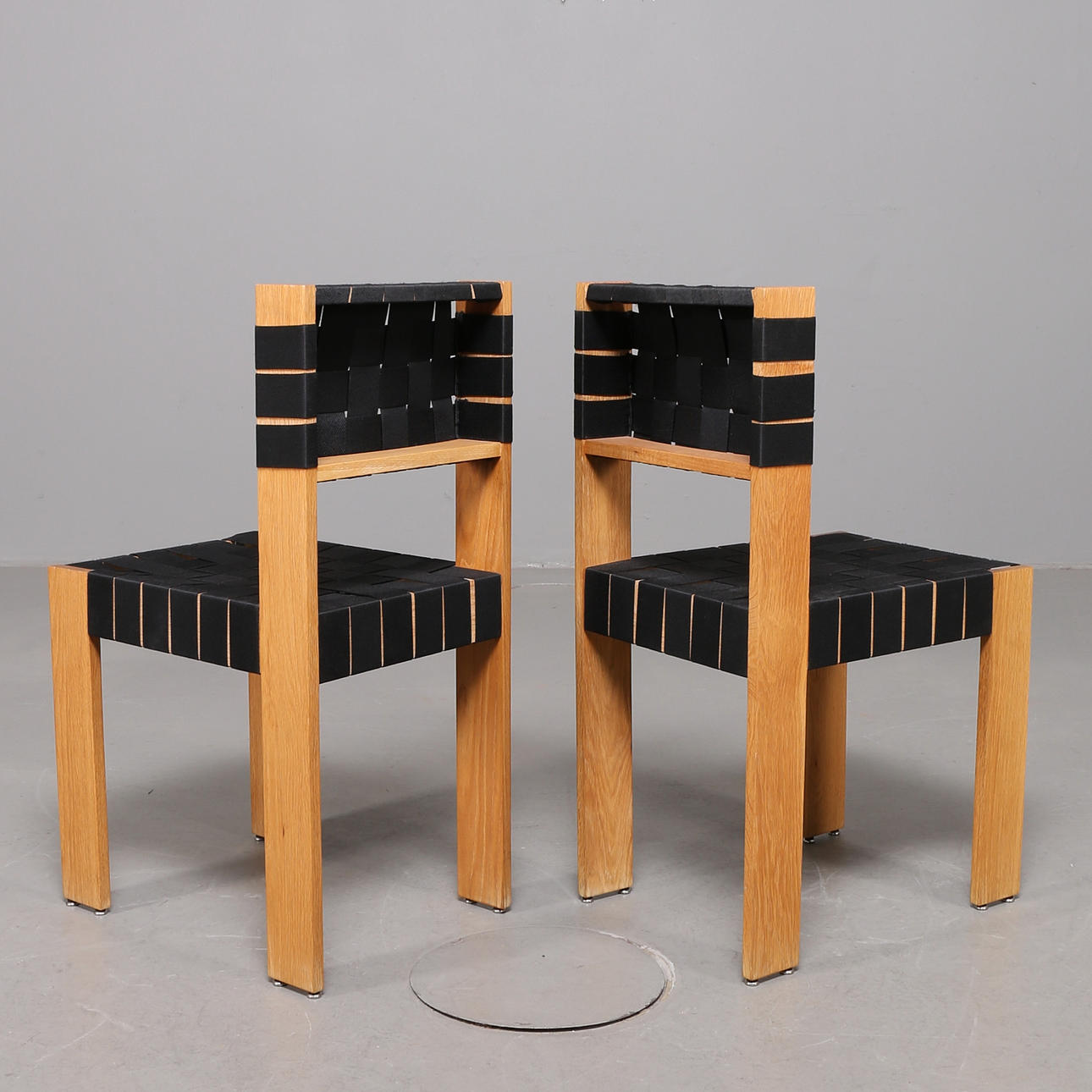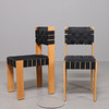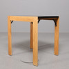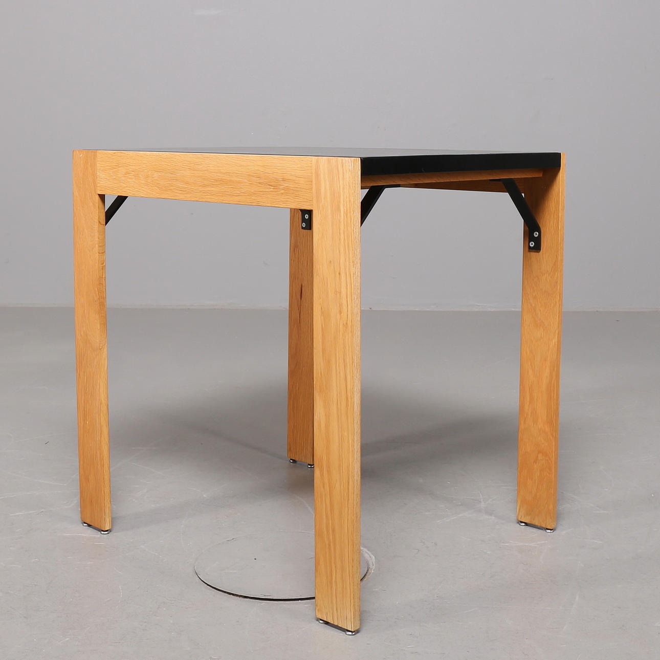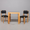 Ek, bord med svartmålad skiva, stolar klädda med svart sadelgjord, mått bord: 60x70 cm höjd 73 cm, höjd stolar 83 cm.