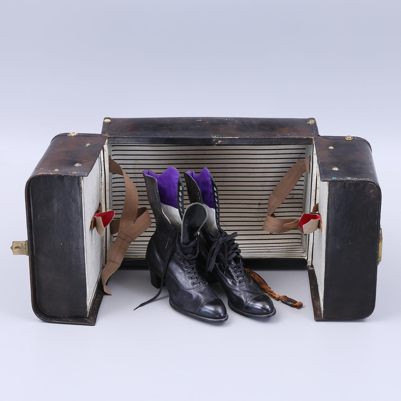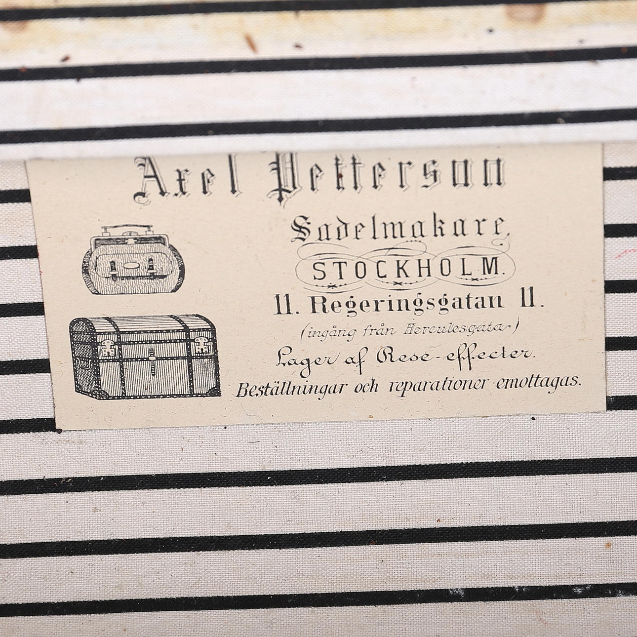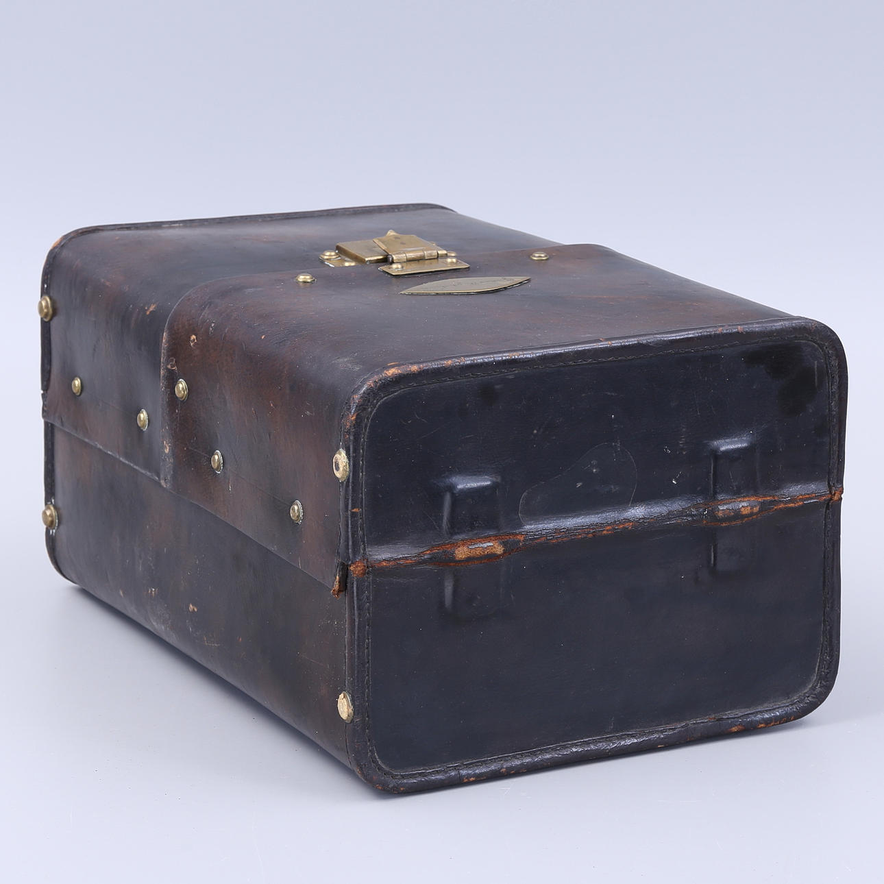 Väska med slitage, repor, märken, skador förekommer, mässingsplakett med gravyr.