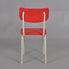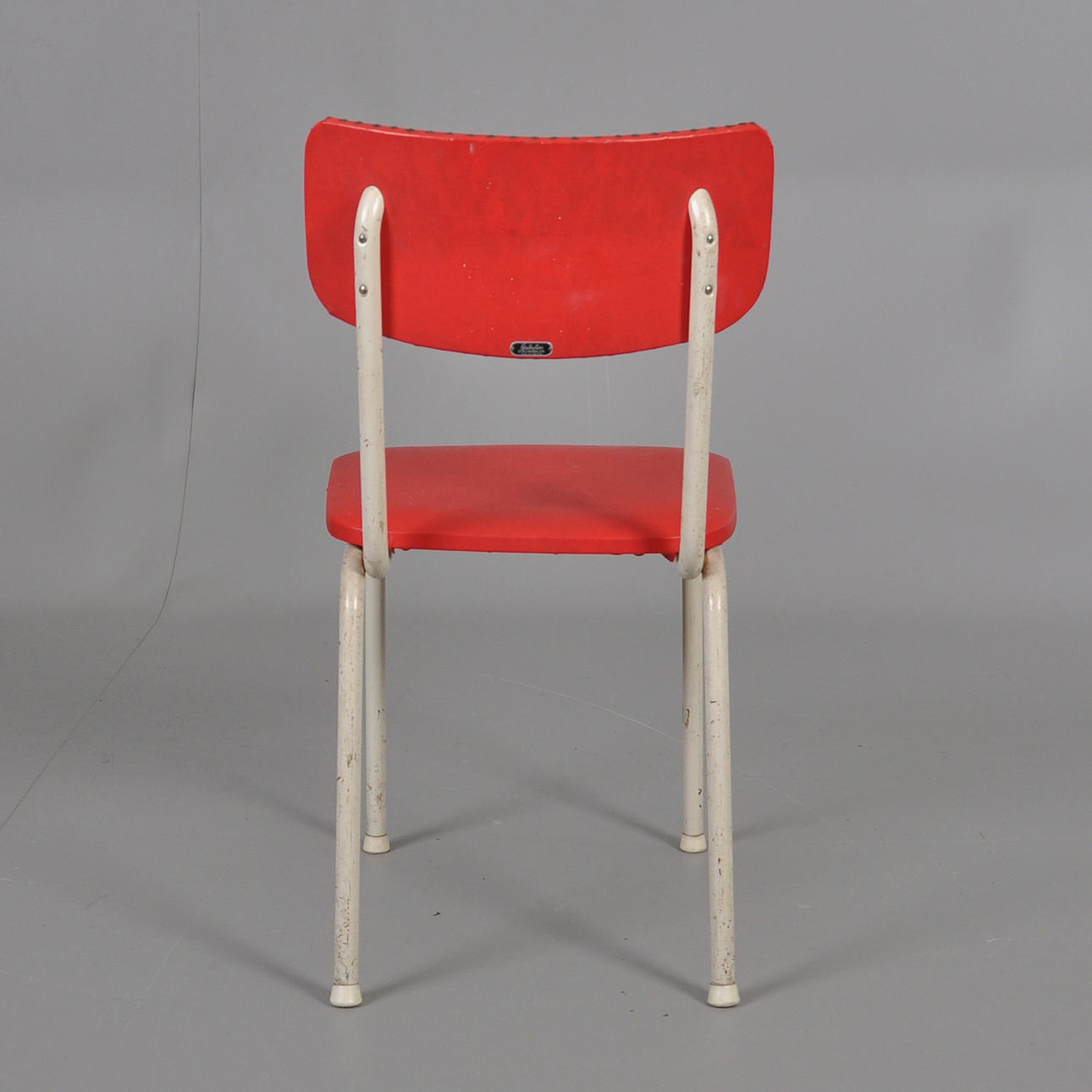 Stomme av metall. Rygg och sits stoppade med galon. Brickmärkt Grythyttans Stålmöbler.