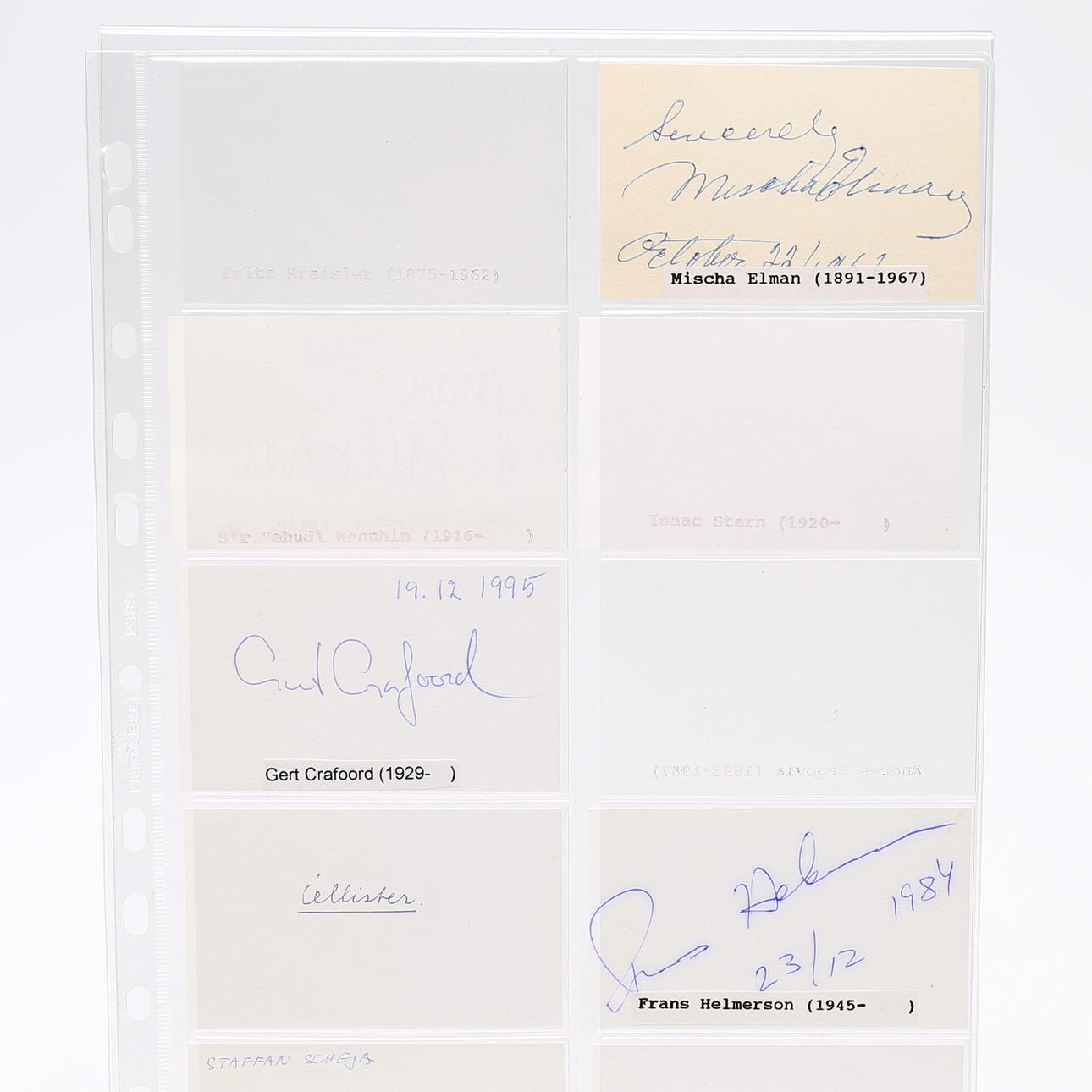 Inger Wikström, Janos Solyom, Gottfrid Boon, Greta Erikson, Alfred Cortot. Ignaz Friedman, José Iturbi, Shuira Cherkassy, Alexander Nrailowsky, Göran Söllscher, Staffan Scheja, Mischa Elman, Gert Craaford, Frans Helmerson- mäter 9 cm. x 5,5 cm. Proveniens: Sverker Hiort af Ornäs autografsamling.