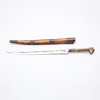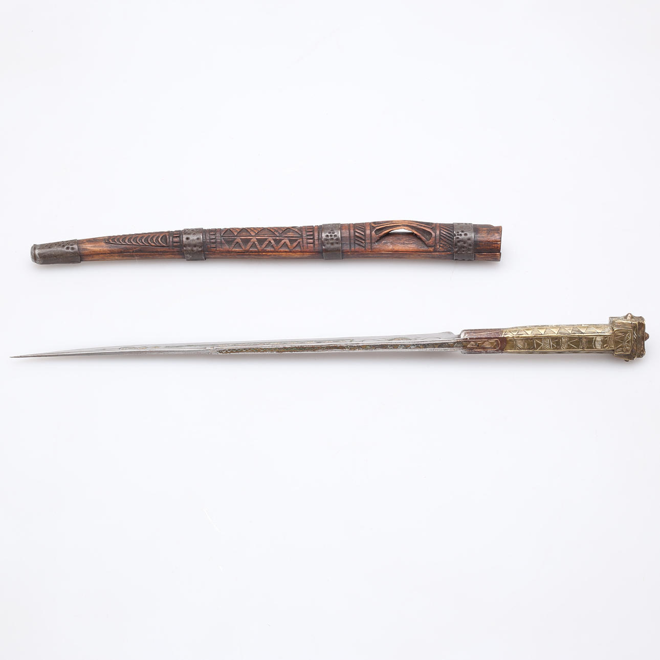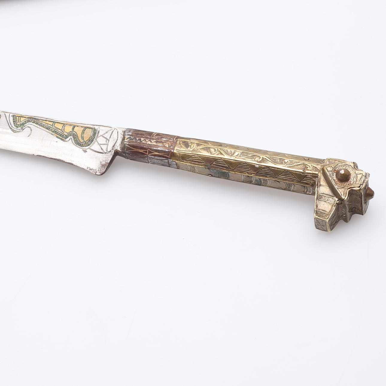 Kniv med dekorerat handtag i mässing samt dekorerad klinga.