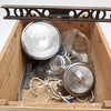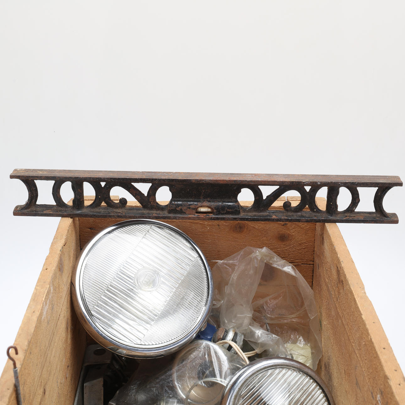 Blandat parti samlar saker till äldre bilar i trälåda.