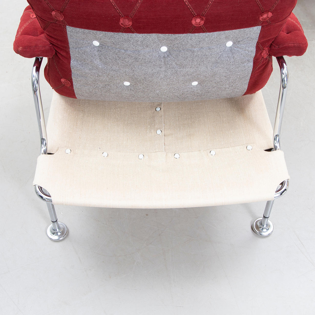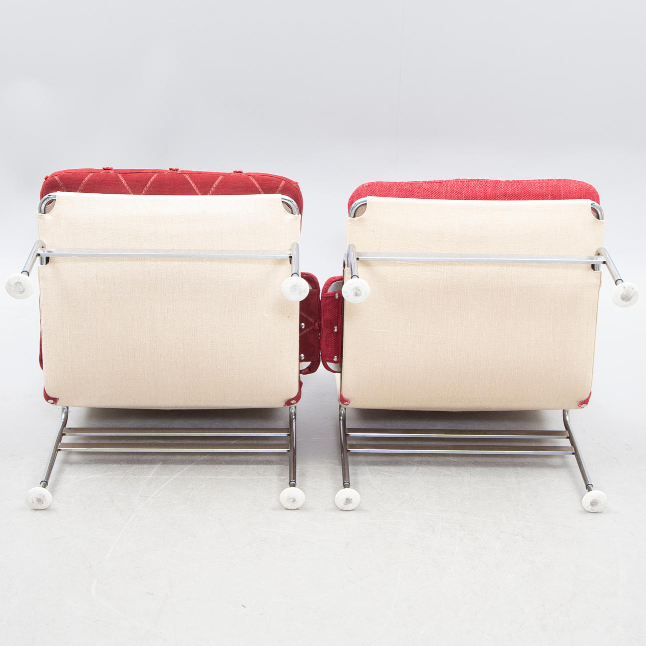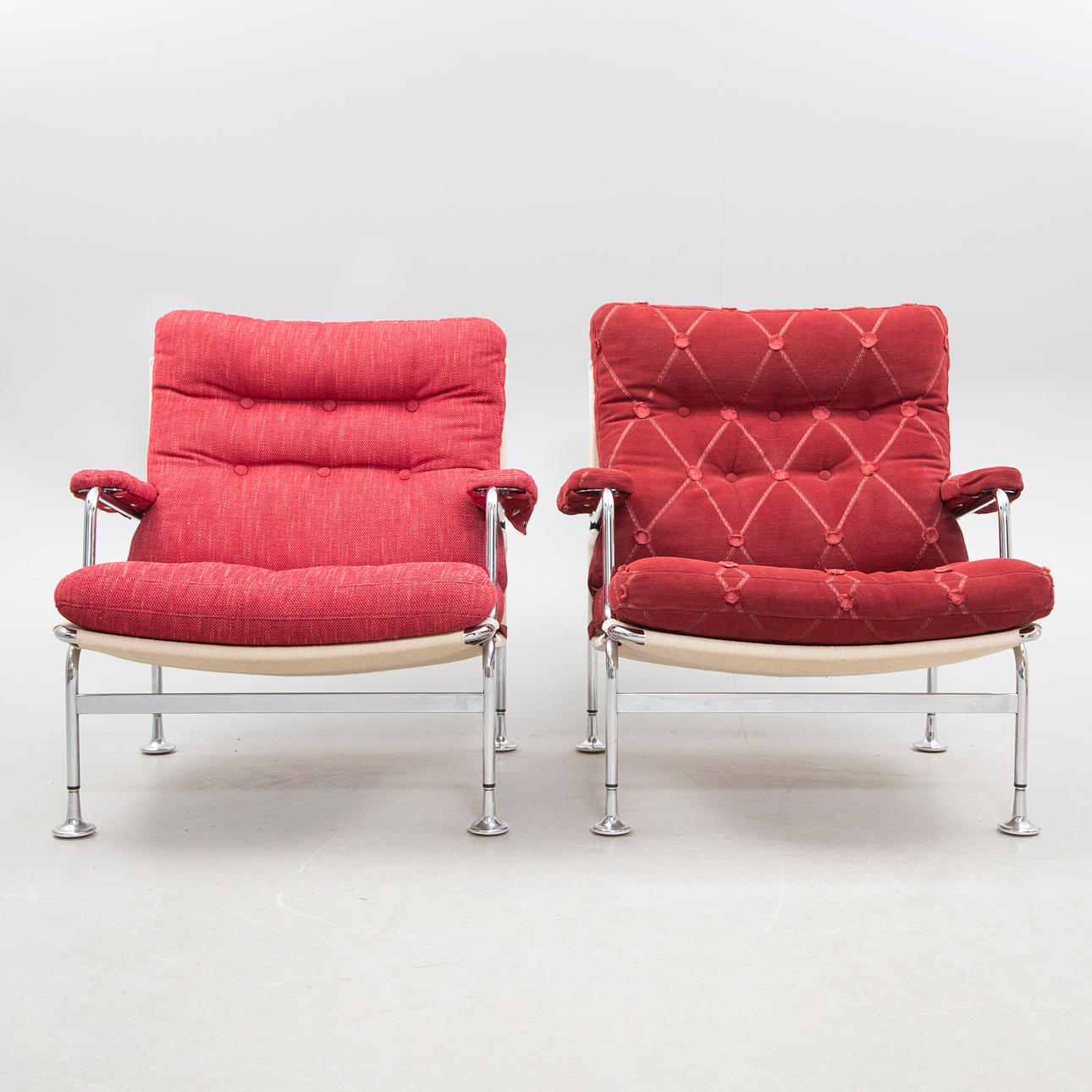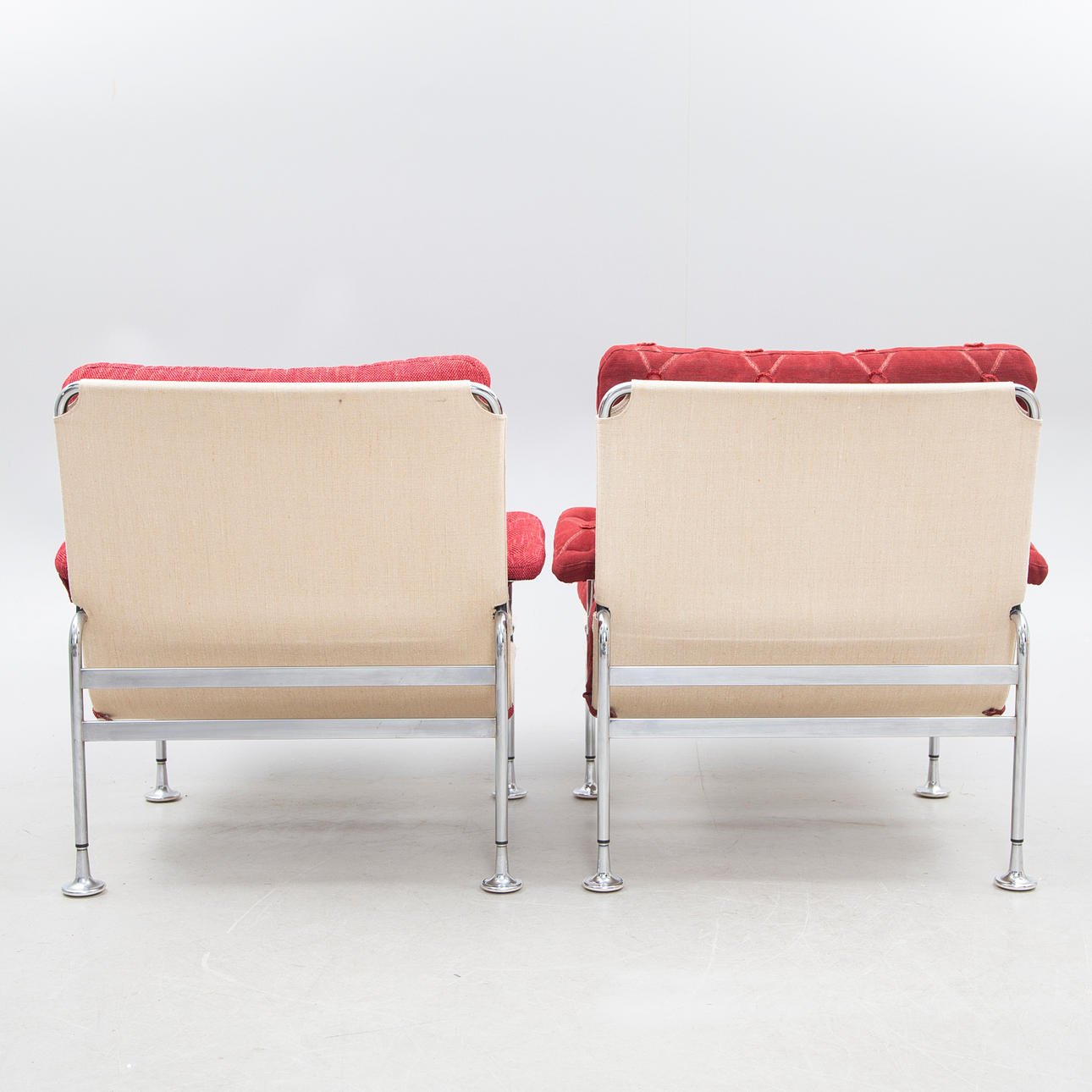 Den ena omklädd med annat tyg. Mindre bruksslitage.