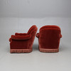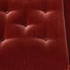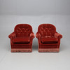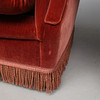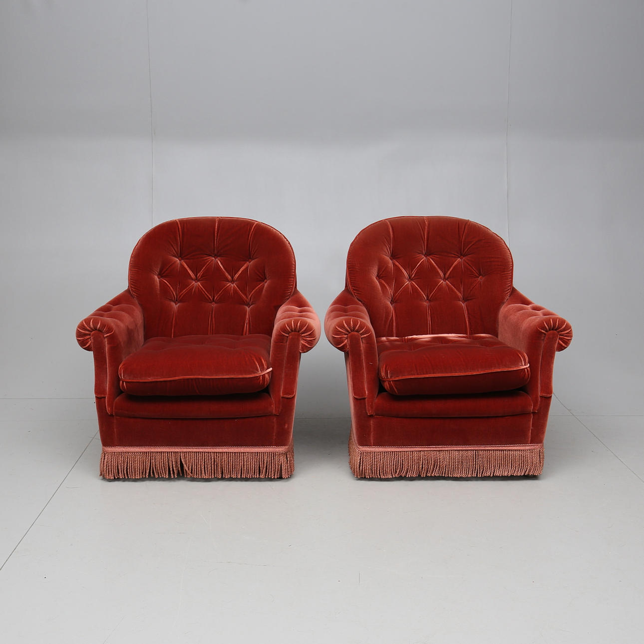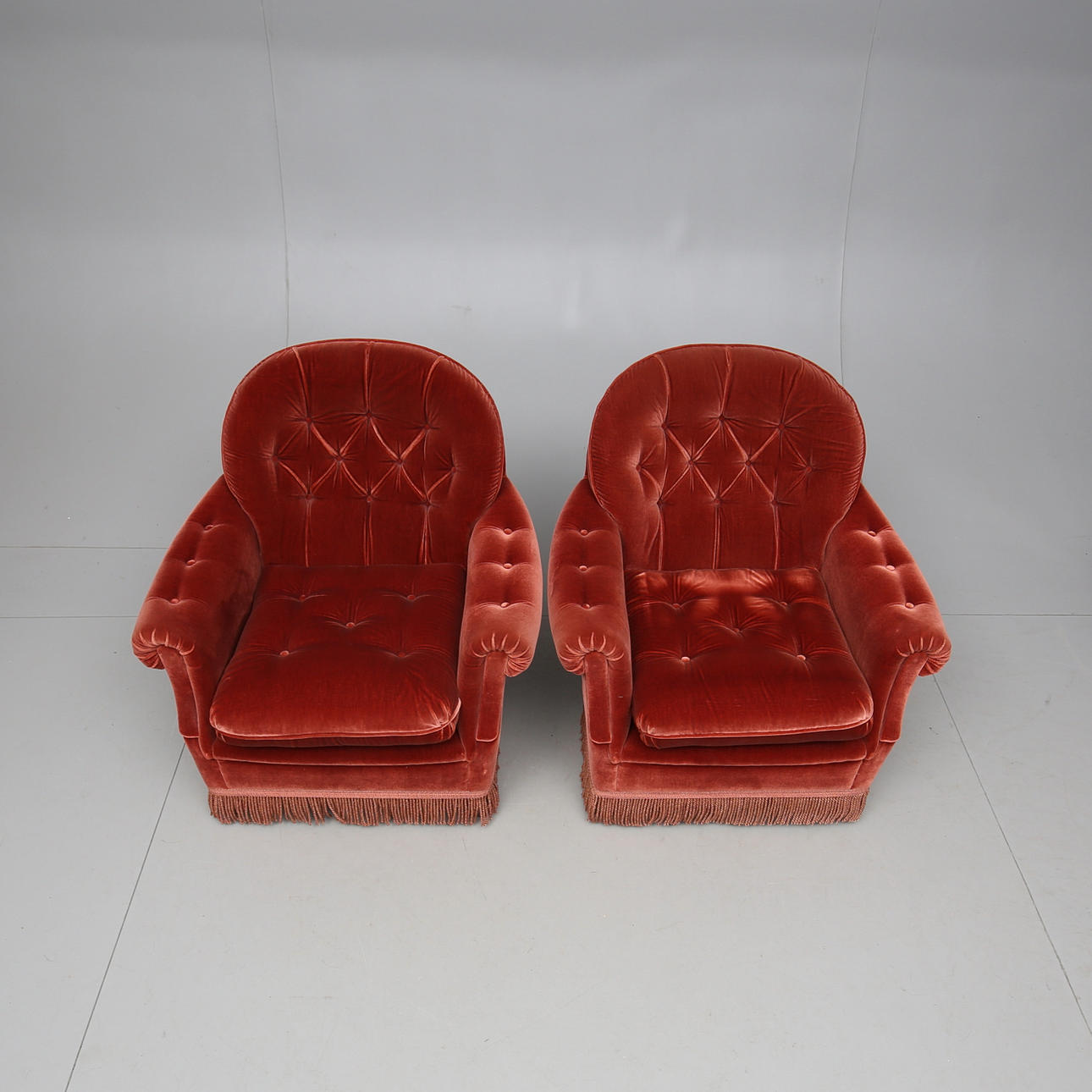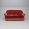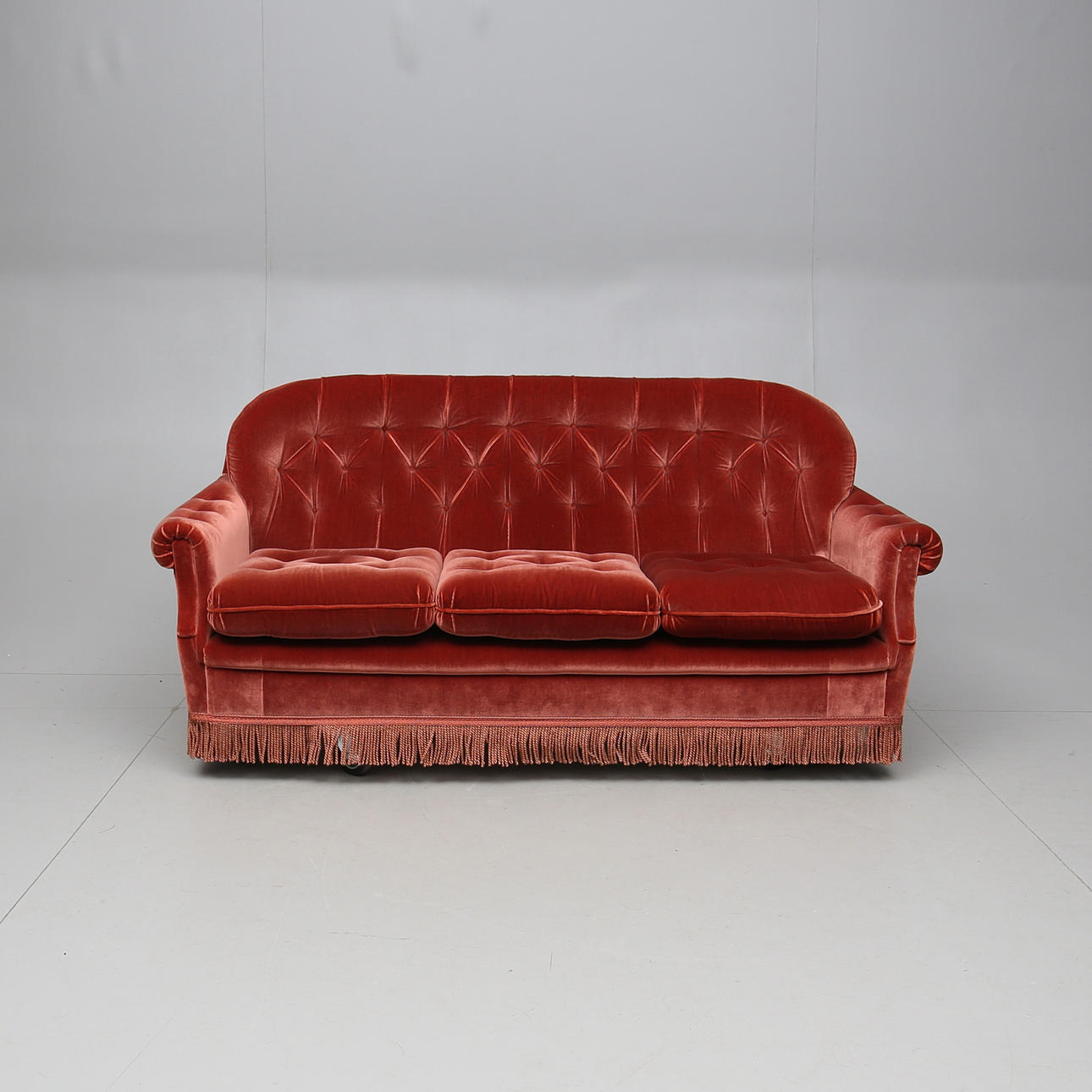 Soffa och två fåtöljer. Fast stoppad rygg, lösa plymåer i sits. Pikerad. Soffans längd ca 183 cm.