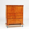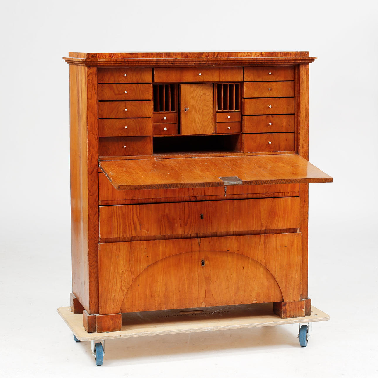 Alm/valnöt. 3 lådor samt fack -och lådinredning bakom skrivklaff. 110 x 50, höjd 125 cm.