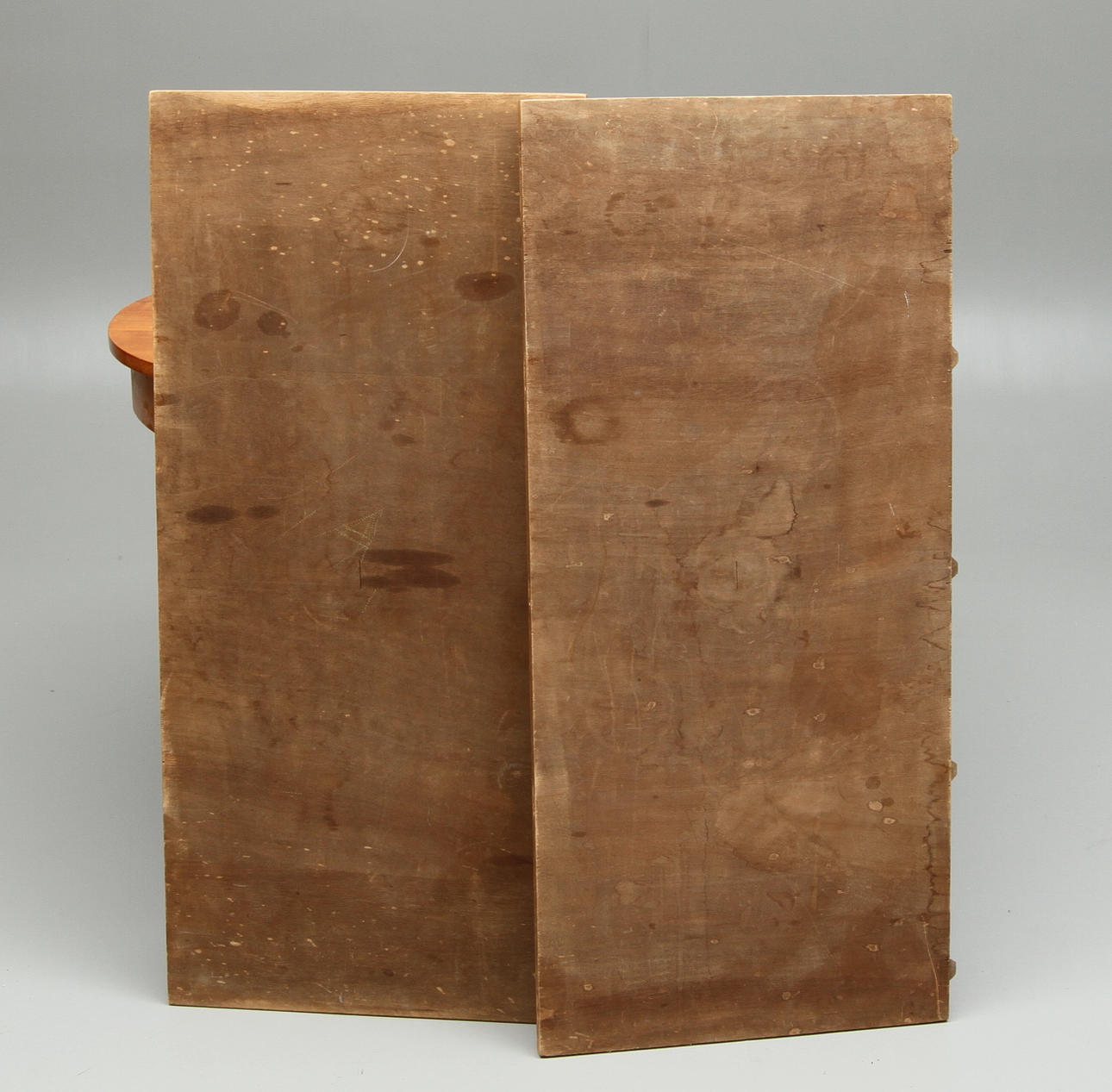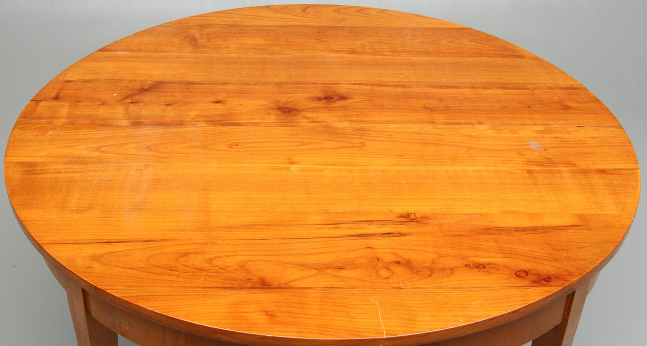 Med två stycken iläggsskivor, 50 cm vardera. Diameter 110, höjd 75 cm.