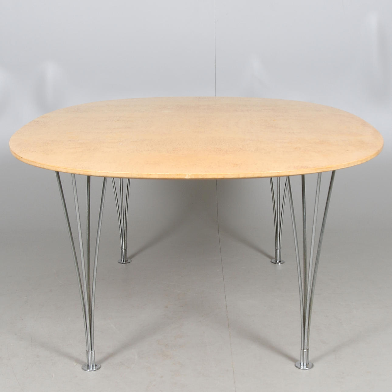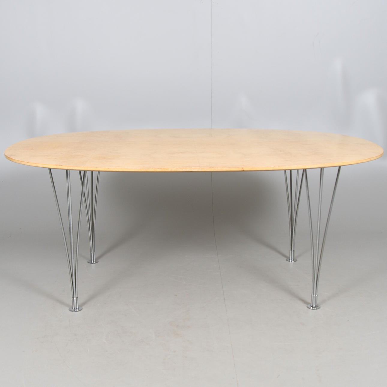 Skiva fanerad med masurbjörk. Ben av kromad metall. Märkt med etikett. Längd 175, bredd 126, höjd 70 cm.