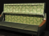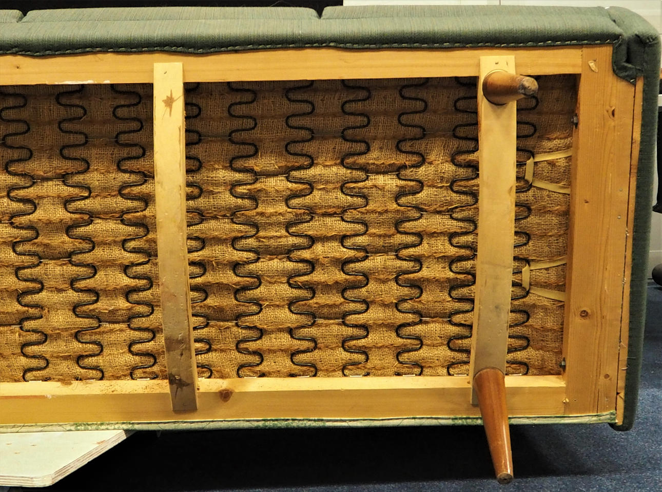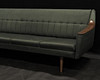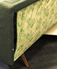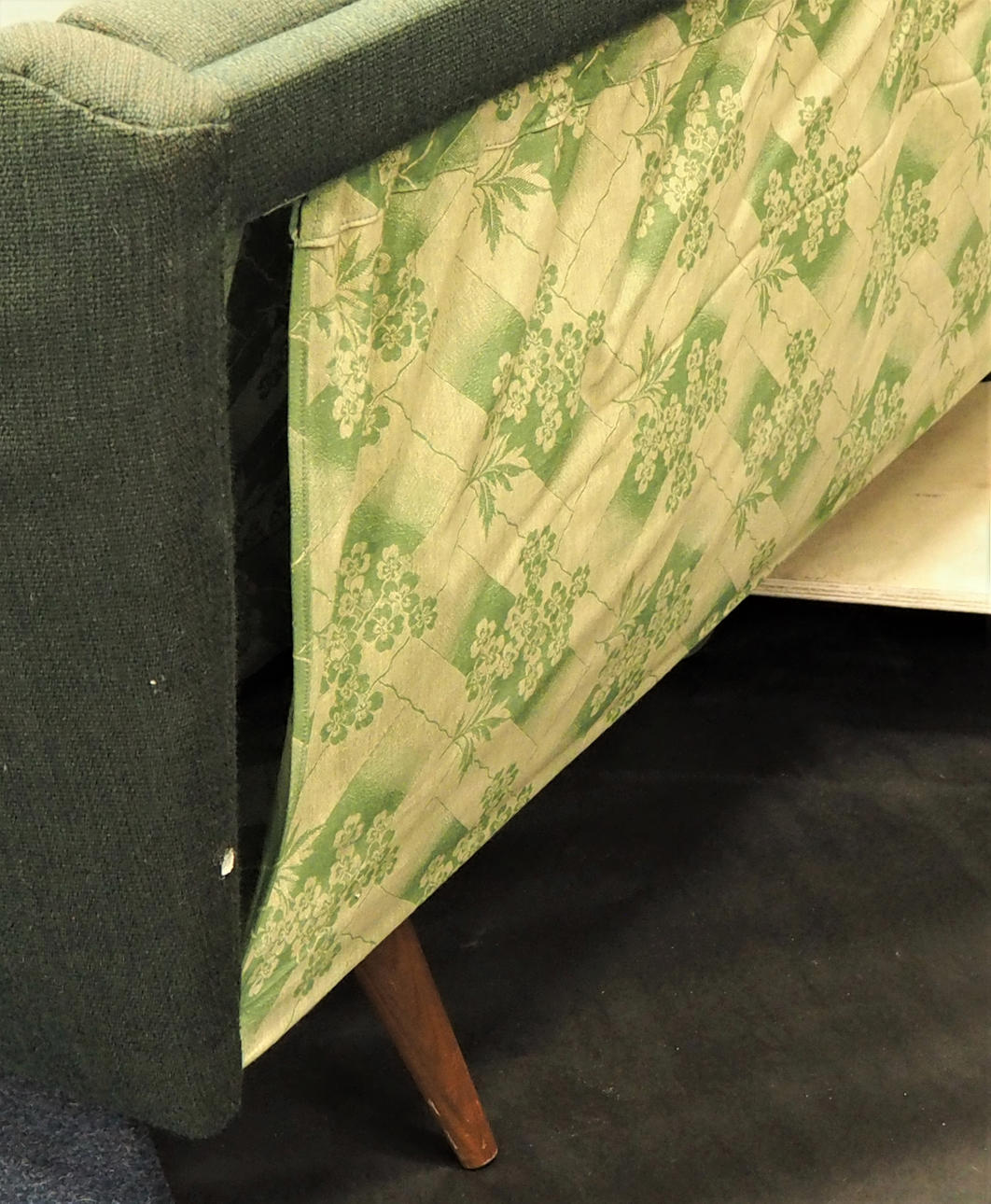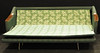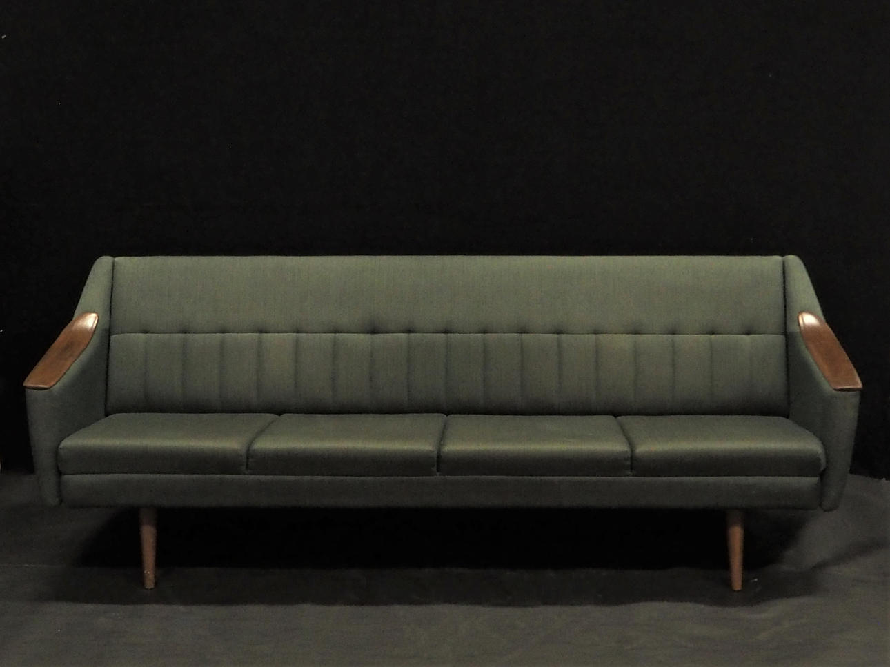 Bäddbar fyrsits soffa klädd i mörkgrönt tyg med trä på armstöd. Längd 215 cm, rygghöjd 75 cm, sitthöjd 40 cm.