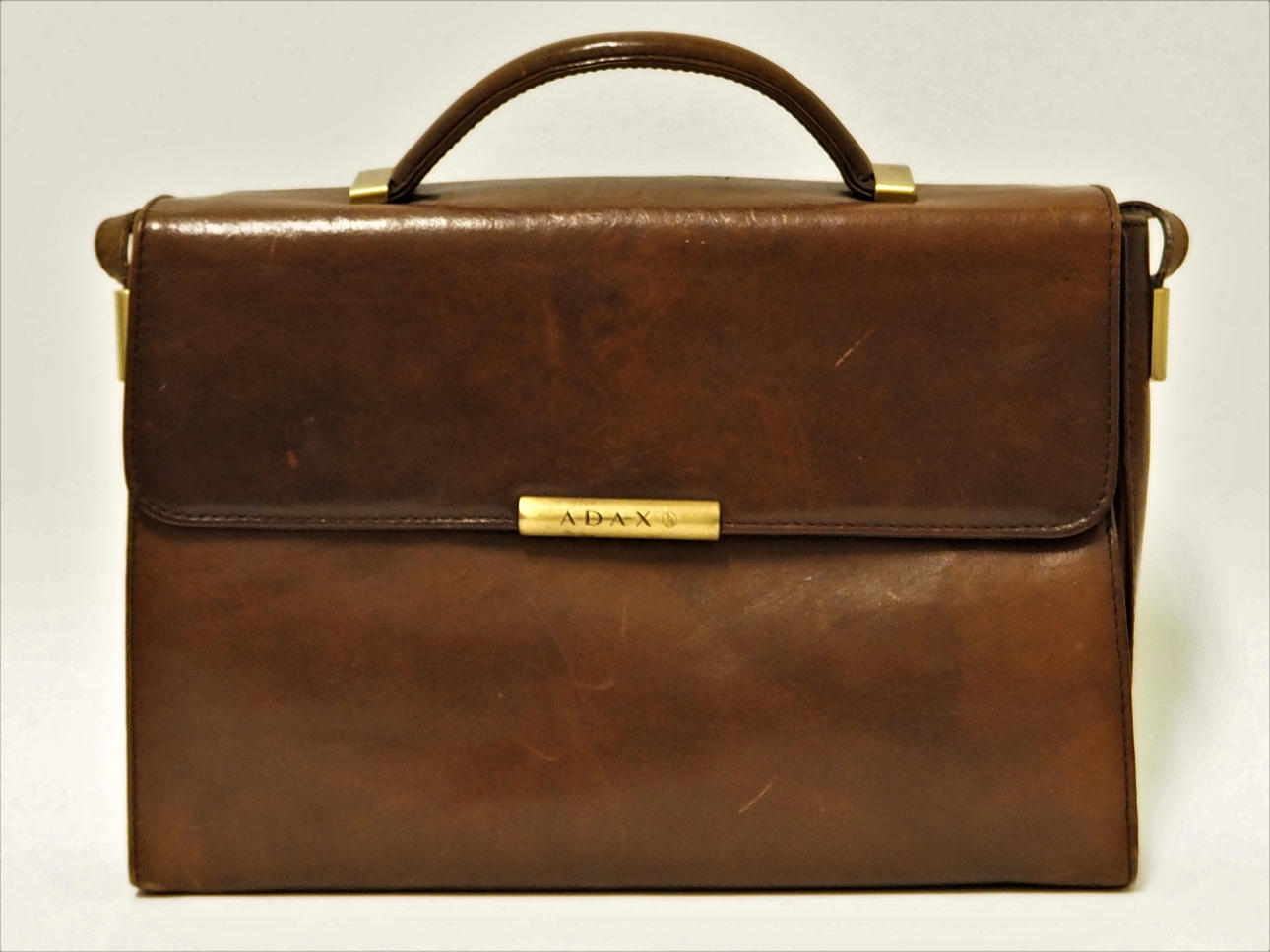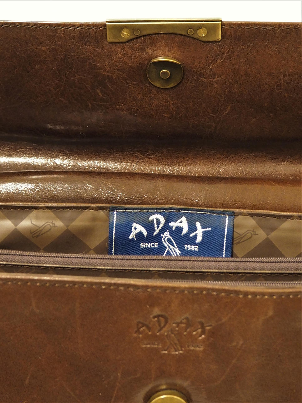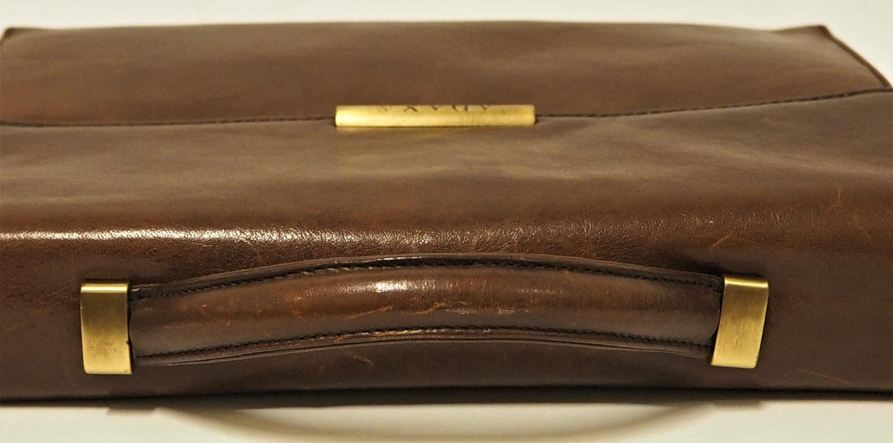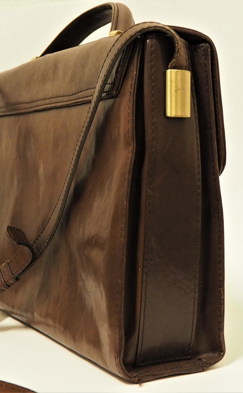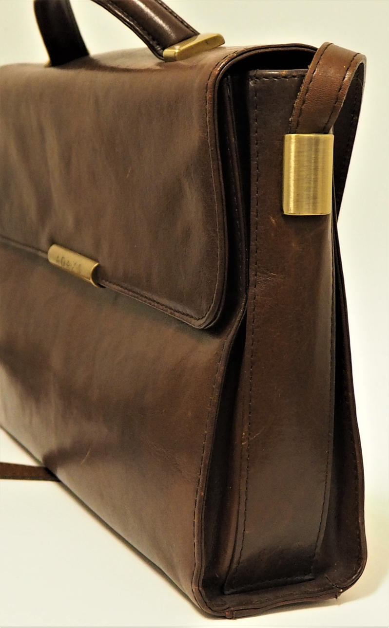 Skinn med 5 invändiga fack, 2 med dragkedja. Längd 30 cm, höjd 20 cm, djup 7 cm.