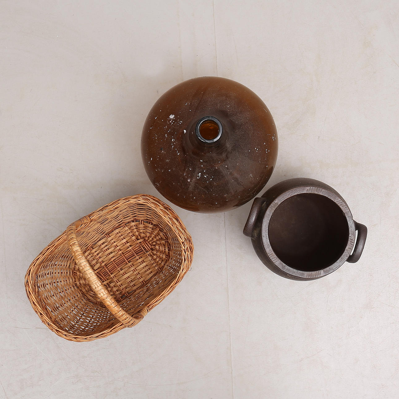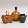 Damejeanne, höjd ca 50 cm. Krus, Höganäs, höjd ca 27 cm. Korg, höjd, ca 41 cm.