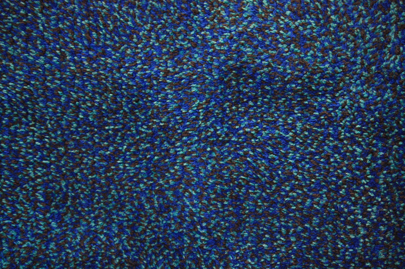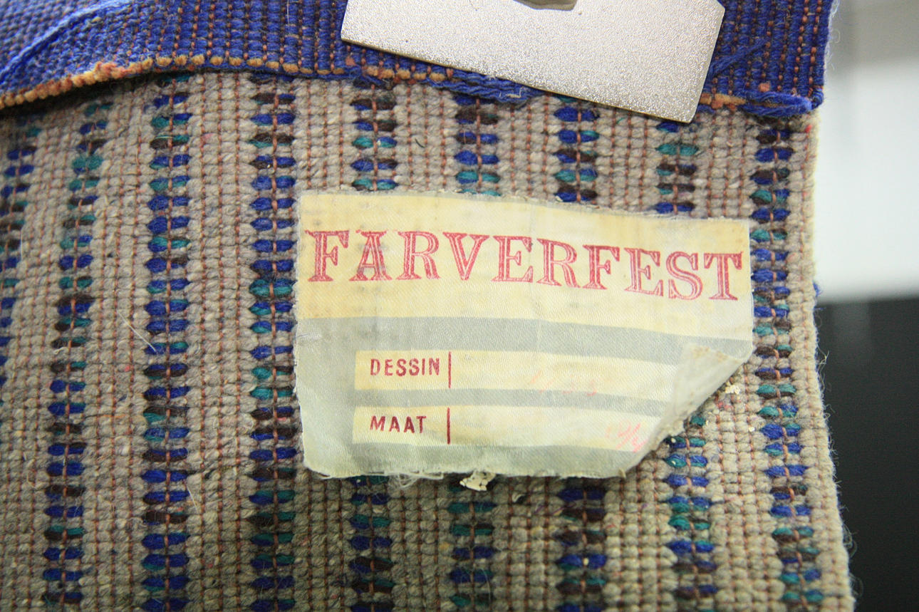 Korthårig ryamatta, märkt Farverfest. blå, turkos och brun.