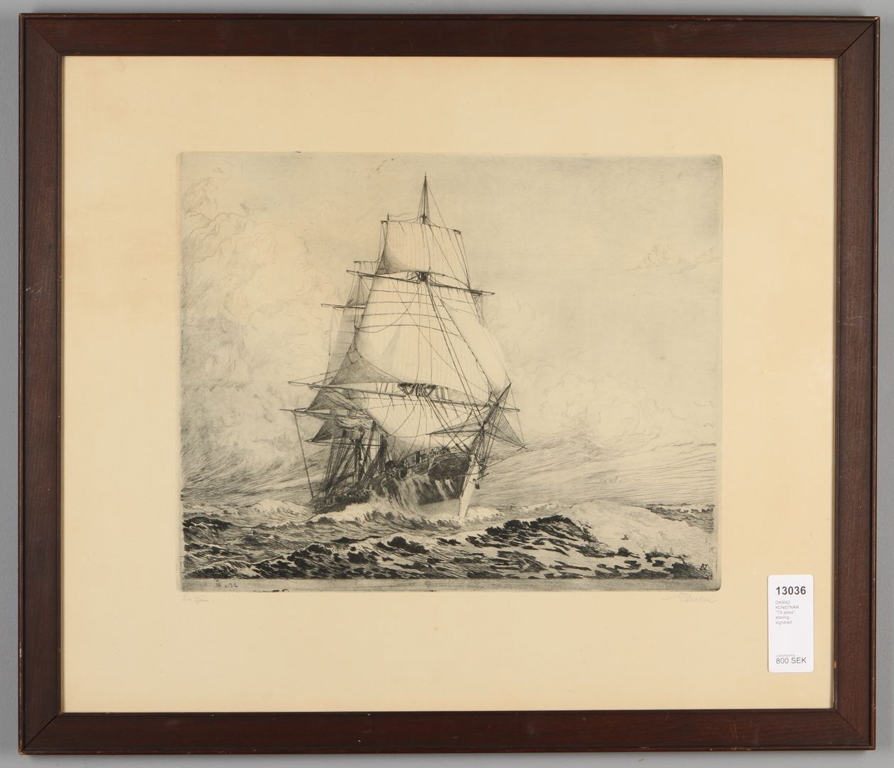 13036. OKÄND KONSTNÄR. "Till sjöss", etsning, signerad.
