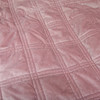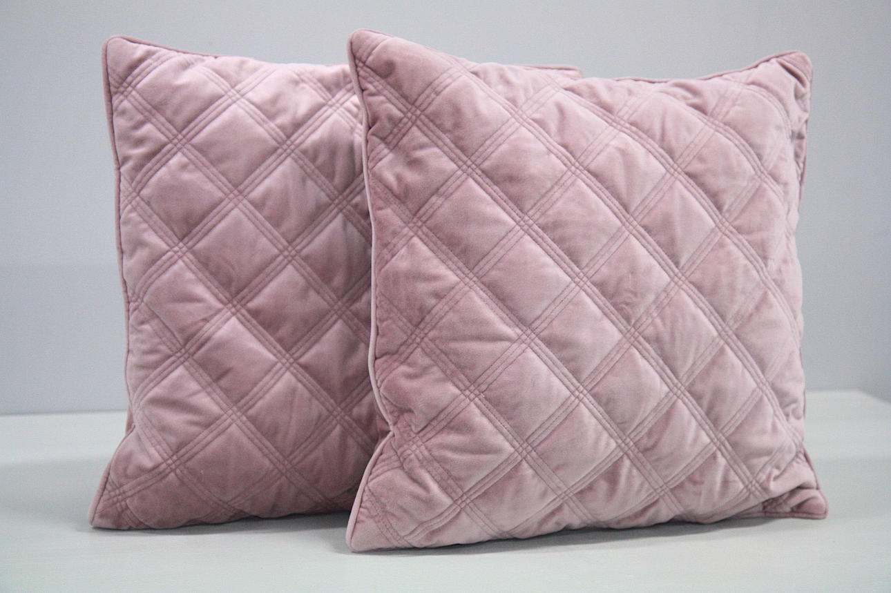 Överkast 260x260 cm, kviltad rosa polyestersammet, fodrat. 30 g maskintvätt. Kuddar i samma utförande, 50x50 cm, avtagbara kuddfodral.
