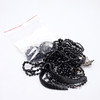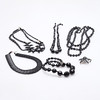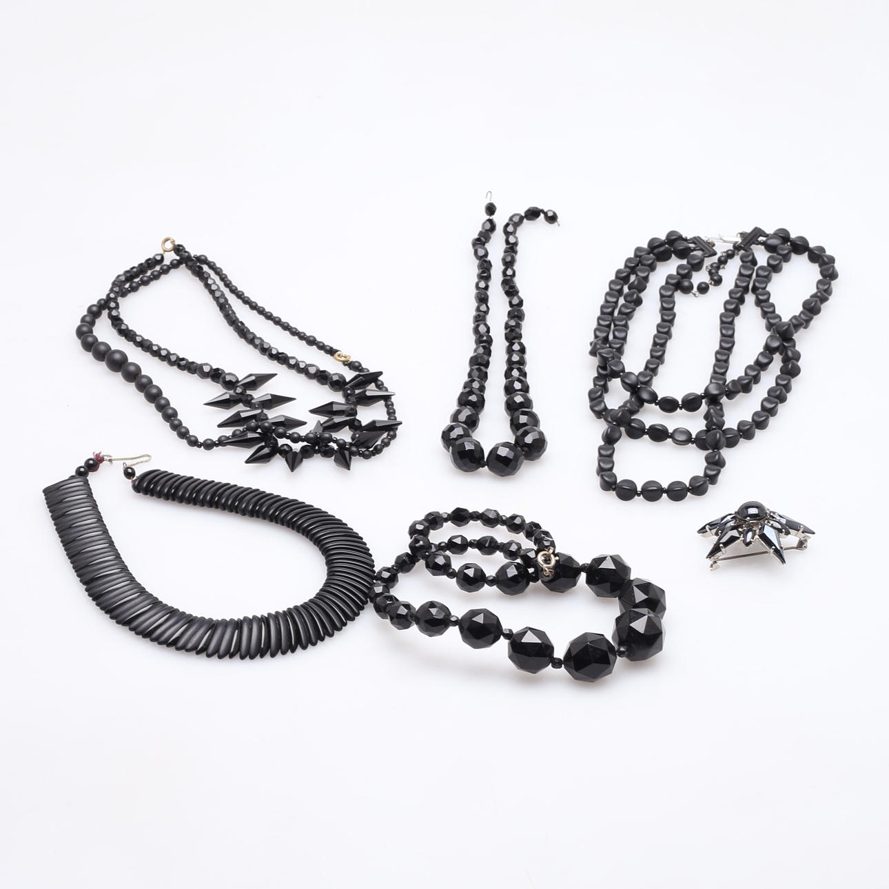 15 collier i olika utföranden och längder, 2 broscher samt lösa pärlor, kolsten och svart glas, merparten 1900-talets första hälft.