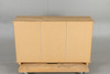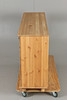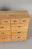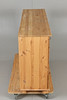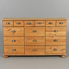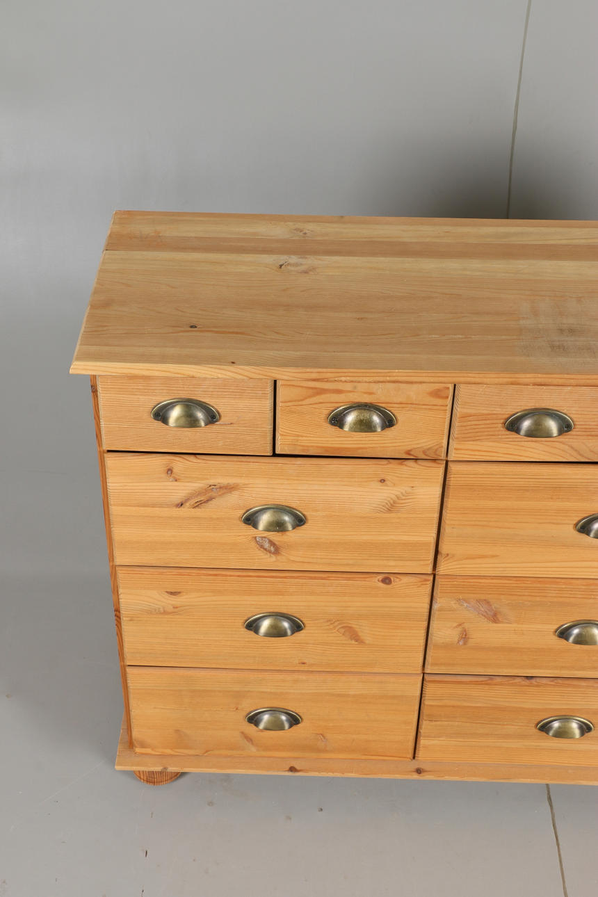 Köpmansdisk i obehandlad furu 15 lådor med paginerade draghandtag Bakstycke samt lådor i masonit Längd 130, bredd 37, höjd 87 cm.