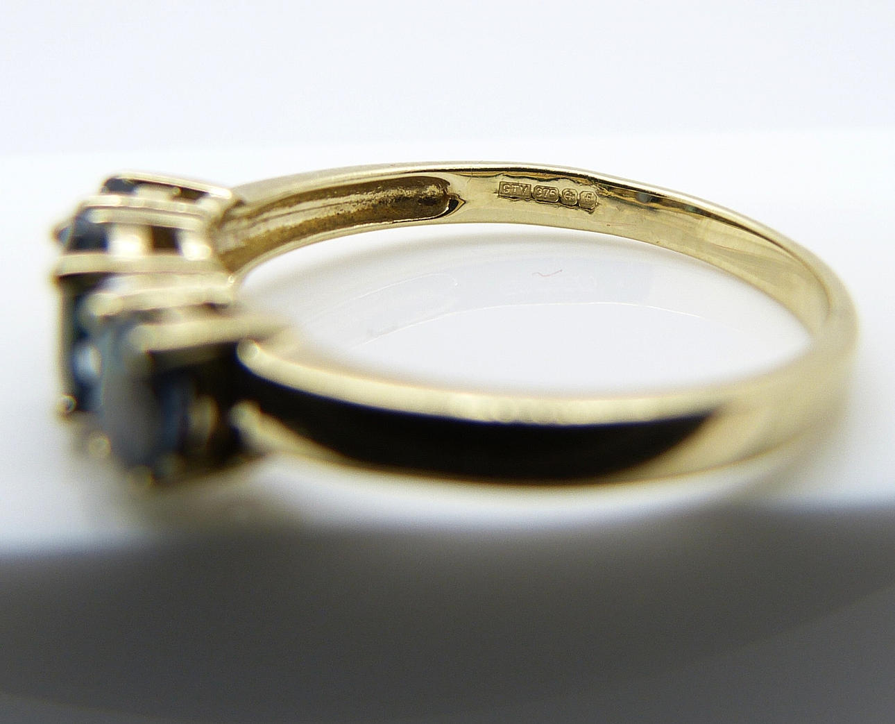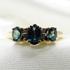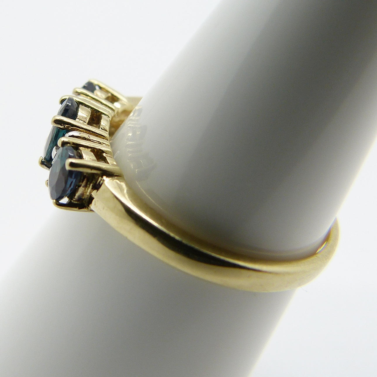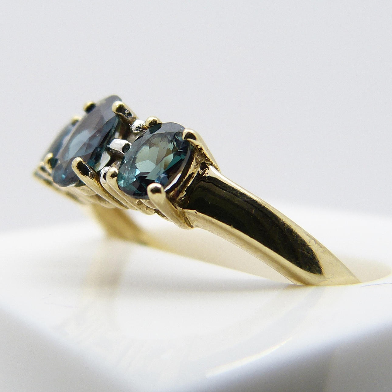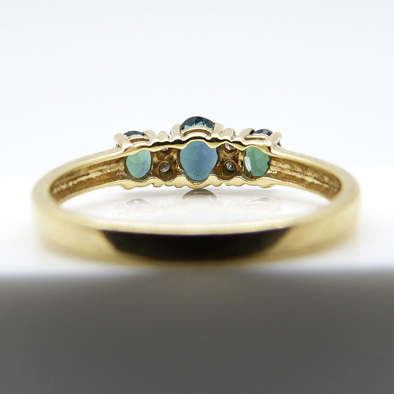 RING, vintage-stil 9k gult guld 3-sten blå/grön/röd alexandrit och diamanter.