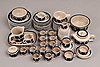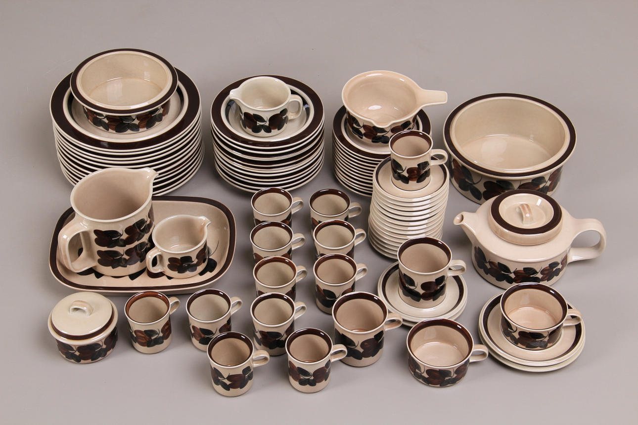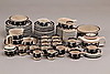 14 Kaffekoppsfat, 2 Tekoppar (hög modell), 2 Tefat, 2 Tekoppar (låg modell), 2 Tefat, Sockerskål, 2 Gräddkannor, Såskanna, Tekanna, Tillbringare, 3 Uppläggningsfat.